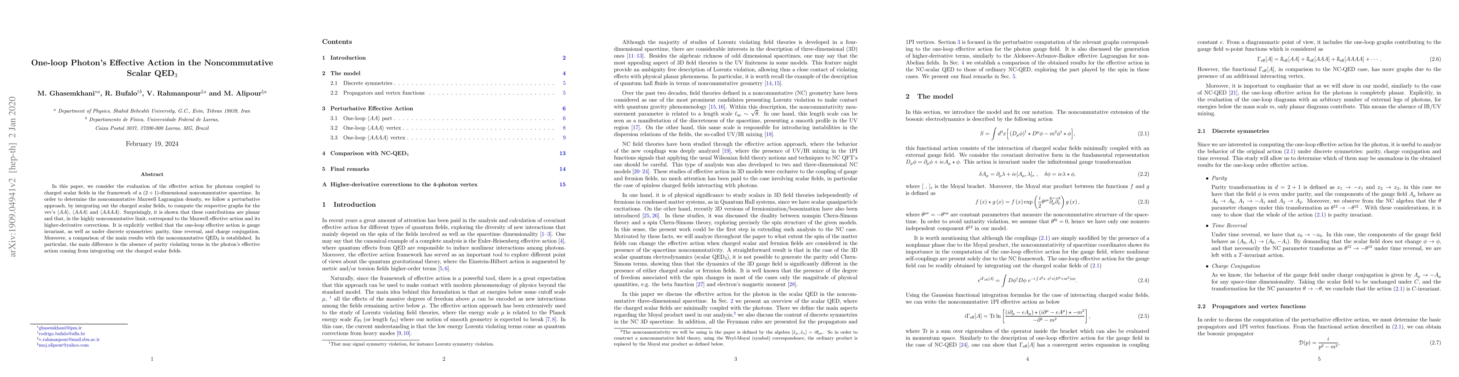 In this paper, we consider the evaluation of the effective action for photons coupled to charged scalar fields in the framework of a $(2+1)$-dimensional noncommutative spacetime. In order to determine the noncommutative Maxwell Lagrangian density, we follow a perturbative approach, by integrating out the charged scalar fields, to compute the respective graphs for the vev's $\left\langle AA \right\rangle$, $\left\langle AAA \right\rangle$ and $\left\langle AAAA \right\rangle$. Surprisingly, it is shown that these contributions are planar and that, in the highly noncommutative limit, correspond to the Maxwell effective action and its higher-derivative corrections. It is explicitly verified that the one-loop effective action is gauge invariant, as well as under discrete symmetries: parity, time reversal and charge conjugation. Moreover, a comparison of the main results with the noncommutative QED$_{3}$ is established. In particular, the main difference is the absence of parity violating terms in the photon's effective action coming from integrating out the charged scalar fields.