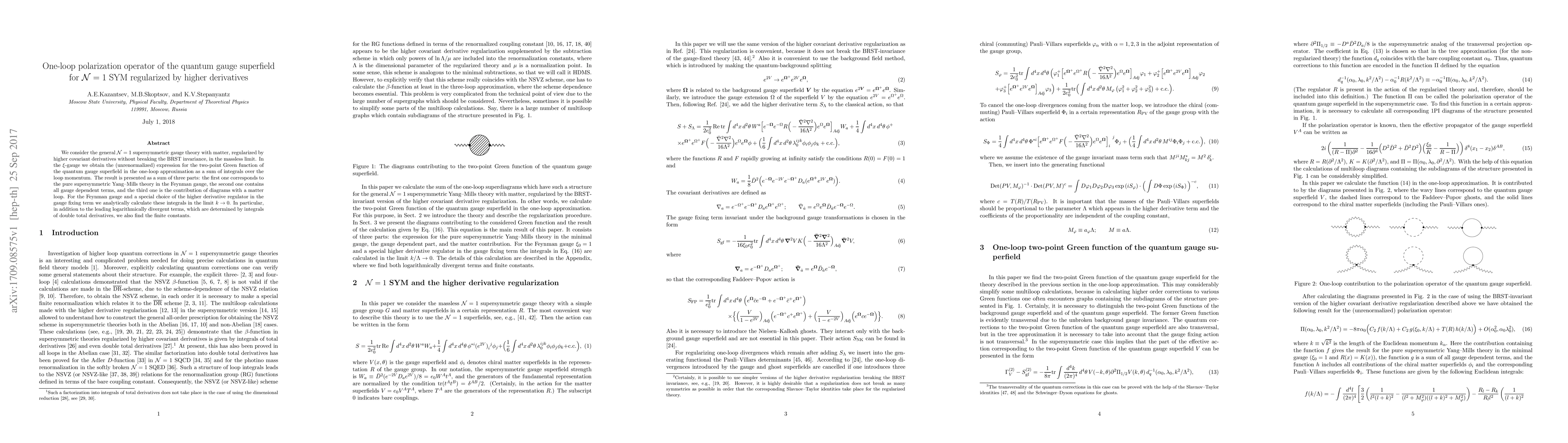 This paper investigates the one-loop polarization operator for the ${\cal N}=1$ supersymmetric gauge theory, regularized by higher derivatives without breaking BRST invariance. The unrenormalized expression for the two-point Green function is decomposed into three parts, and integrals are analytically calculated for the Feynman gauge, revealing both logarithmic divergences and finite constants.