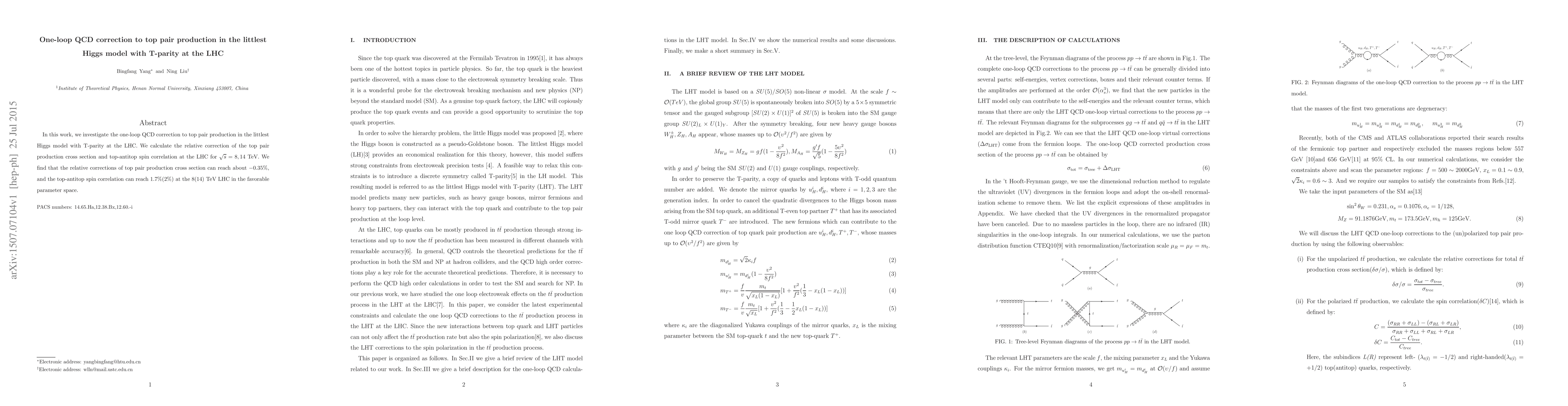 This paper calculates the one-loop QCD correction to top pair production in the littlest Higgs model with T-parity at the LHC, finding relative corrections of about $-0.35\%$ for the cross section and $1.7\%$ ($2\%$) for top-antitop spin correlation at 8 TeV (14 TeV).