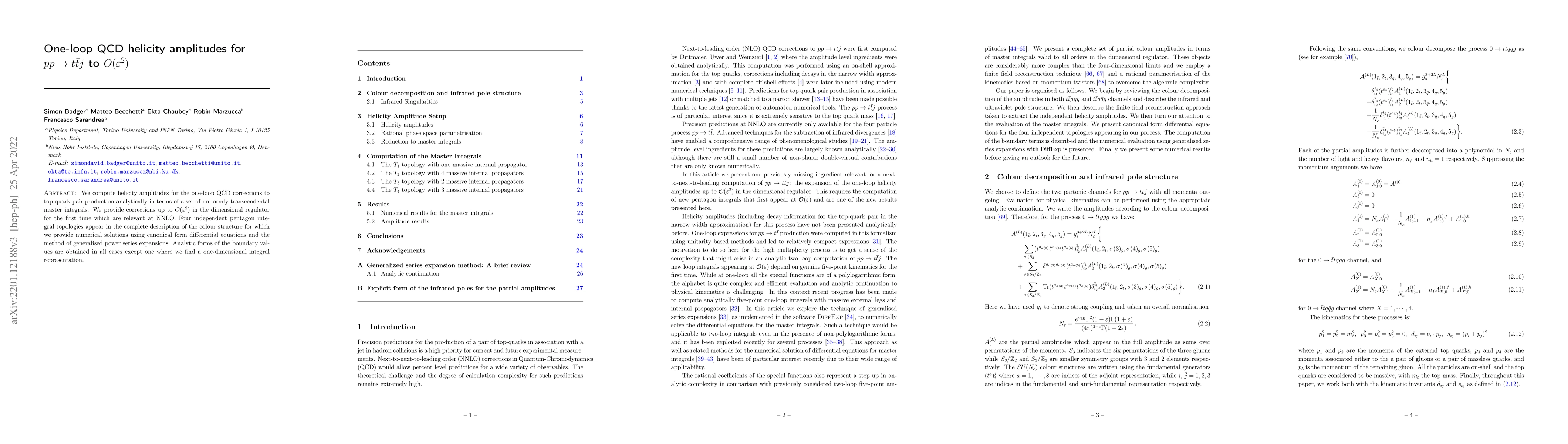 We compute helicity amplitudes for the one-loop QCD corrections to top-quark pair production analytically in terms of a set of uniformly transcendental master integrals. We provide corrections up to $O(\epsilon^2)$ in the dimensional regulator for the first time which are relevant at NNLO. Four independent pentagon integral topologies appear in the complete description of the colour structure for which we provide numerical solutions using canonical form differential equations and the method of generalised power series expansions. Analytic forms of the boundary values are obtained in all cases except one where we find a one-dimensional integral representation.