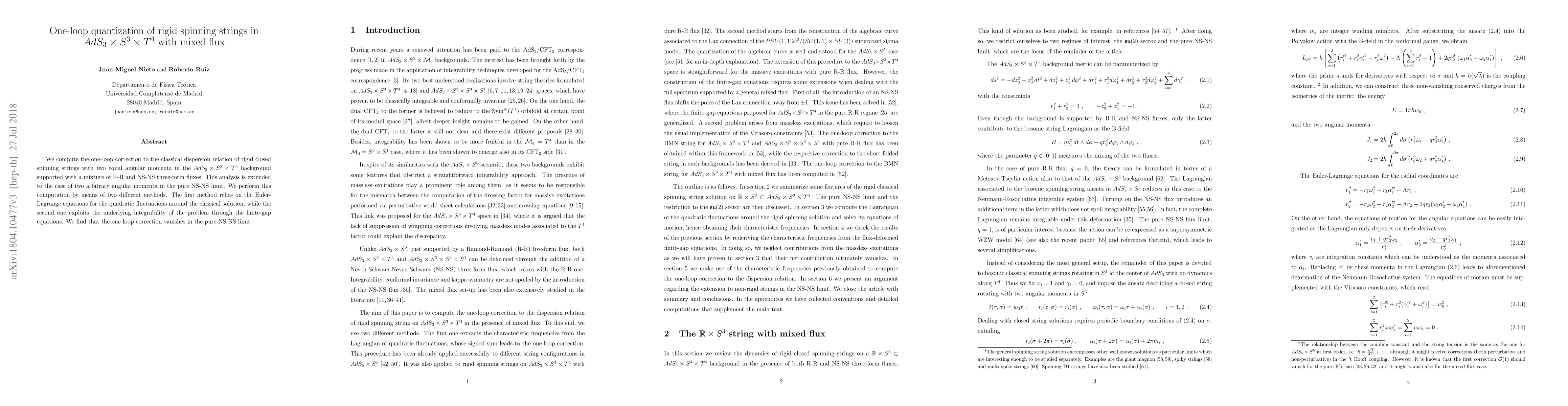This paper computes the one-loop correction to the dispersion relation of rigid spinning strings in an $AdS_3 \times S^3 \times T^4$ background with mixed R-R and NS-NS fluxes, finding no correction in the pure NS-NS limit. The analysis uses both Euler-Lagrange equations and integrability through finite-gap equations.