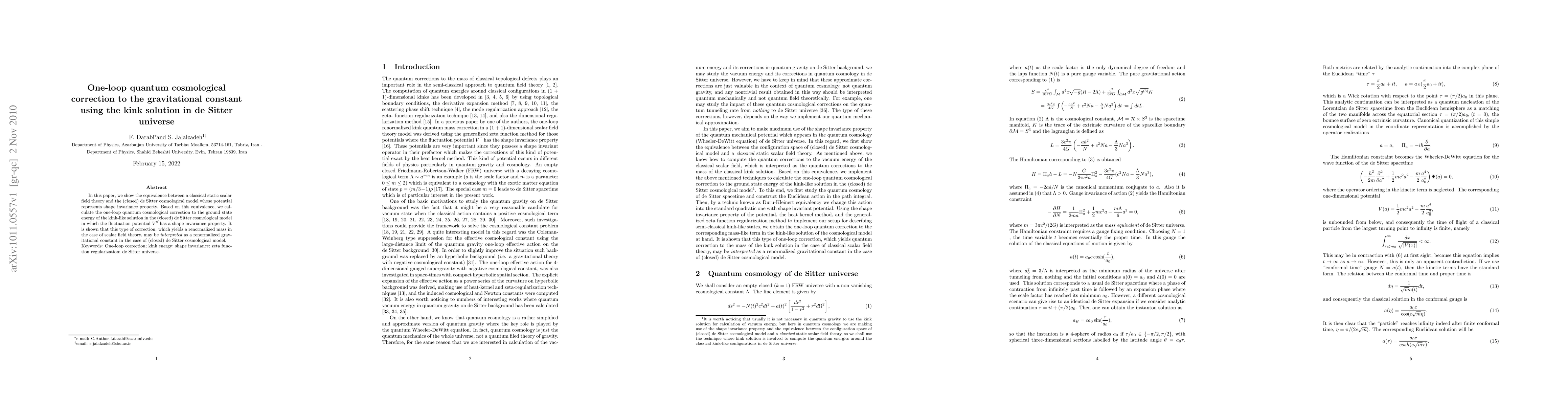 In this paper, we show the equivalence between a classical static scalar field theory and the (closed) de Sitter cosmological model whose potential represents shape invariance property. Based on this equivalence, we calculate the one-loop quantum cosmological correction to the ground state energy of the kink-like solution in the (closed) de Sitter cosmological model in which the fluctuation potential $V^{\prime\prime}$ has a shape invariance property. It is shown that this type of correction, which yields a renormalized mass in the case of scalar field theory, may be {\it interpreted} as a renormalized gravitational constant in the case of (closed) de Sitter cosmological model. Keywords: One-loop correction; kink energy; shape invariance; zeta function regularization; de Sitter universe.