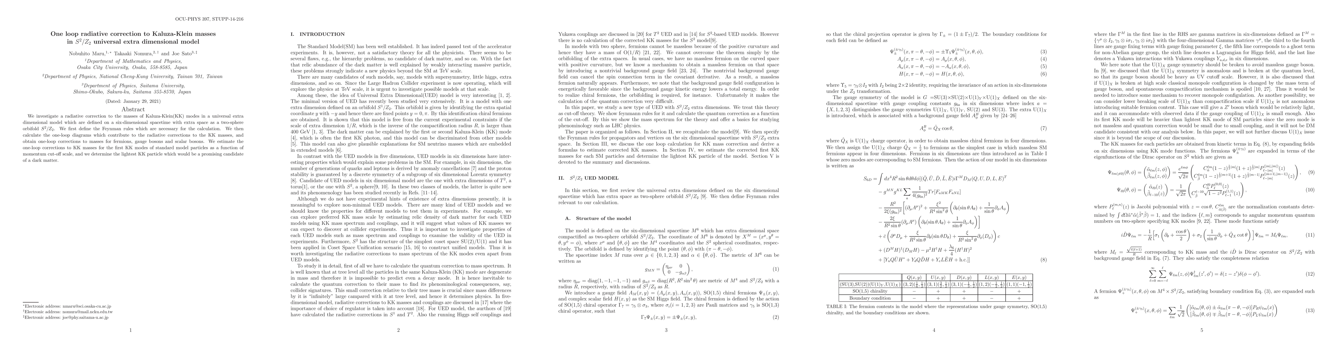 This research investigates the one-loop radiative corrections to Kaluza-Klein (KK) masses in a universal extra dimensional model with a $S^2/Z_2$ orbifold structure. It calculates the contributions from one-loop diagrams to KK masses for fermions, gauge bosons, and scalar bosons, and determines the lightest KK particle as a potential dark matter candidate.