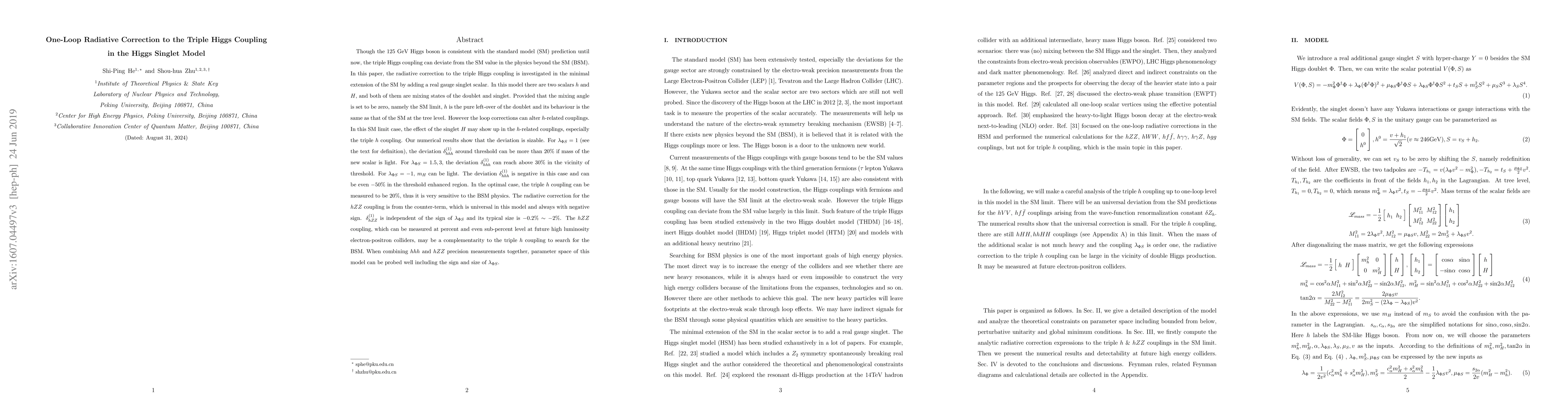 Though the 125 GeV Higgs boson is consistent with the standard model (SM) prediction until now, the triple Higgs coupling can deviate from the SM value in the physics beyond the SM (BSM). In this paper, the radiative correction to the triple Higgs coupling is investigated in the minimal extension of the SM by adding a real gauge singlet scalar. In this model there are two scalars $h$ and $H$, and both of them are mixing states of the doublet and singlet. Provided that the mixing angle is set to be zero, namely the SM limit, $h$ is the pure left-over of the doublet and its behaviour is the same as that of the SM at the tree level. However the loop corrections can alter $h$-related couplings. In this SM limit case, the effect of the singlet $H$ may show up in the $h$-related couplings, especially the triple $h$ coupling. Our numerical results show that the deviation is sizable. For $\lambda_{\Phi{S}}=1$ (see the text for definition), the deviation $\delta_{hhh}^{(1)}$ around threshold can be more than $20\%$ if mass of the new scalar is light. For $\lambda_{\Phi{S}}=1.5,3$, the deviation $\delta_{hhh}^{(1)}$ can reach above $30\%$ in the vicinity of threshold. For $\lambda_{\Phi{S}}=-1$, $m_H$ can be light. The deviation $\delta_{hhh}^{(1)}$ is negative in this case and can be even $-50\%$ in the threshold enhanced region. The radiative correction for the $hZZ$ coupling is from the counter-term, which is universal in this model and always with negative sign. $\delta_{hZZ}^{(1)}$ is independent of the sign of $\lambda_{\Phi{S}}$ and its typical size is $-0.2\%\sim-2\%$. When combining $hhh$ and $hZZ$ precision measurements together, parameter space of this model can be probed well including the sign and size of $\lambda_{\Phi{S}}$.