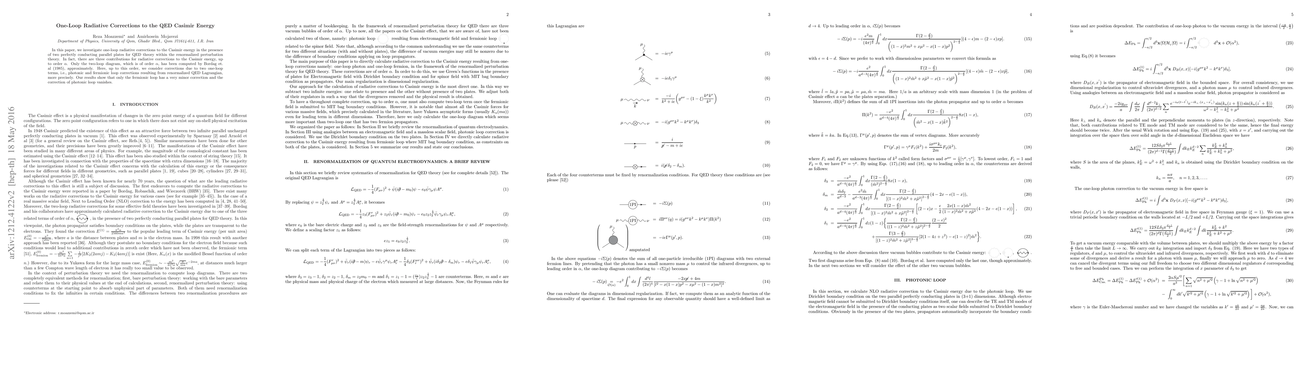 This paper examines one-loop radiative corrections to the Casimir energy between two parallel conducting plates in QED, revealing minor fermionic loop corrections and no photonic loop corrections in the renormalized perturbation theory.
