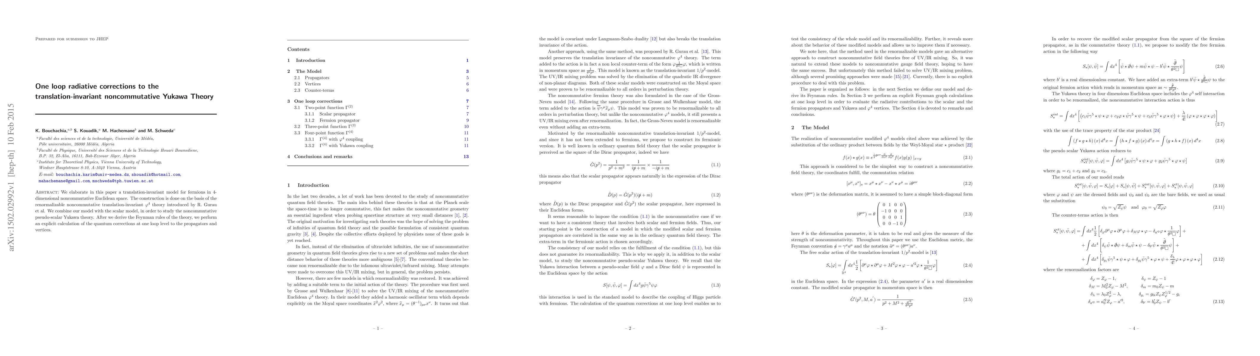 We elaborate in this paper a translation-invariant model for fermions in 4-dimensional noncommutative Euclidean space. The construction is done on the basis of the renormalizable noncommutative translation-invariant Phi4 theory introduced by R. Gurau et al. We combine our model with the scalar model, in order to study the noncommutative pseudo-scalar Yukawa theory. After we derive the Feynman rules of the theory, we perform an explicit calculation of the quantum corrections at one loop level to the propagators and vertices.