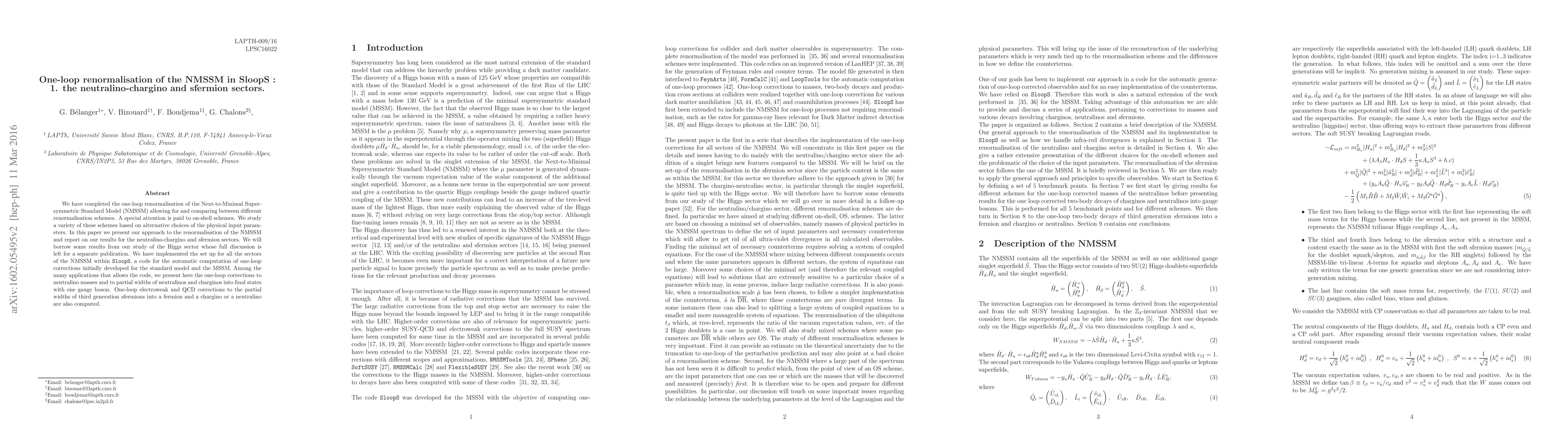 This paper completes the one-loop renormalisation of the NMSSM, focusing on neutralino-chargino and sfermion sectors, using various on-shell schemes. It reports results implemented in \sloops, covering one-loop corrections for neutralino masses, decay widths, and third-generation sfermions.