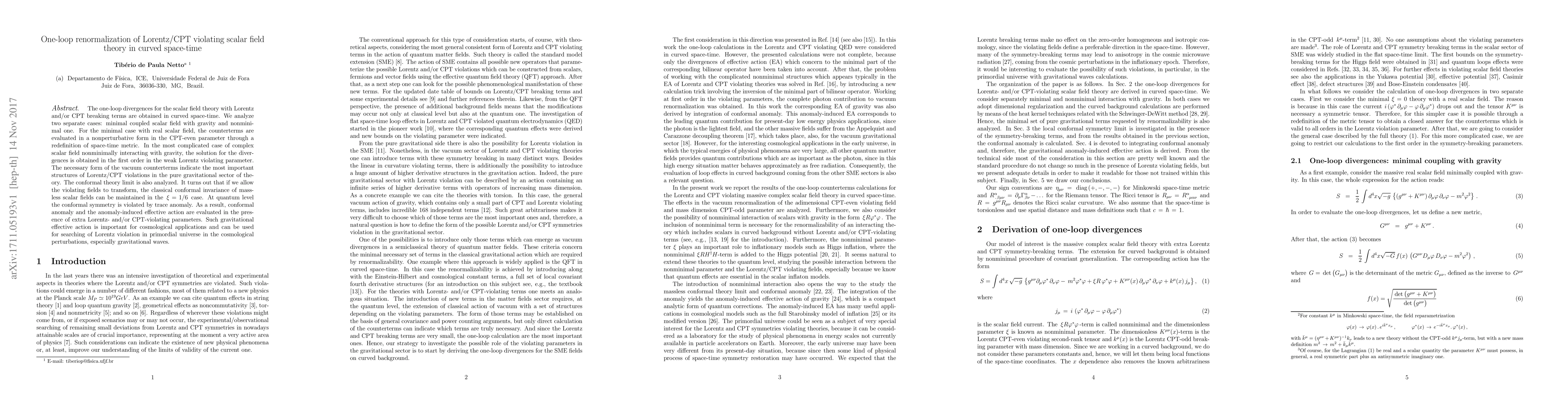 This paper investigates one-loop renormalization of scalar field theories with Lorentz and CPT violations in curved spacetime, analyzing both minimal and nonminimal couplings to gravity. It finds that conformal invariance can be preserved in certain cases, while quantum conformal symmetry is violated by a trace anomaly, leading to an effective gravitational action with implications for cosmological studies and searches for Lorentz violation in gravitational waves.