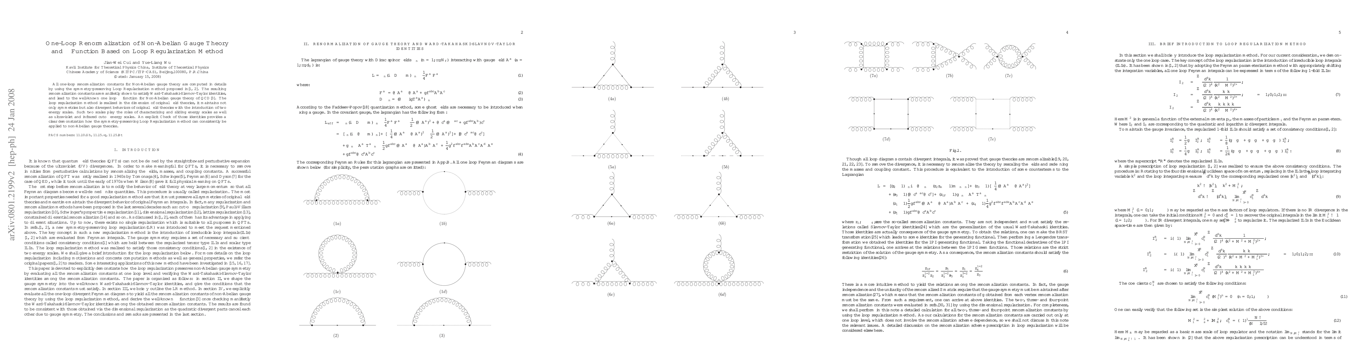 The paper presents detailed computations of one-loop renormalization constants using the Loop Regularization method, explicitly showing how it maintains symmetries and divergent behaviors.