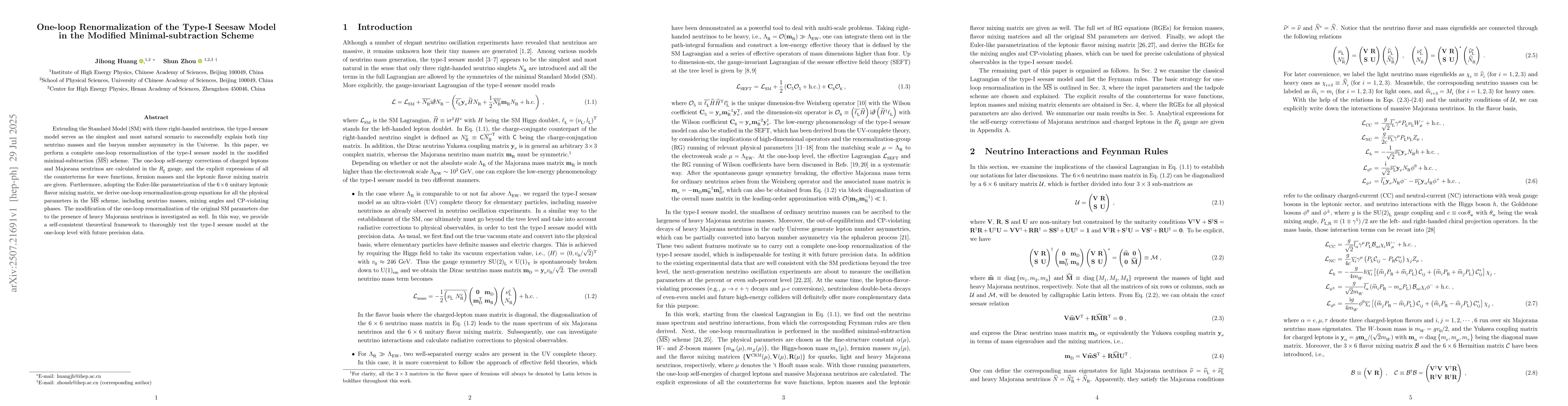 The research performs a complete one-loop renormalization of the Type-I seesaw model in the modified minimal-subtraction scheme, calculating self-energy corrections for charged leptons and Majorana neutrinos in the Rξ gauge, including tadpole contributions for gauge independence.