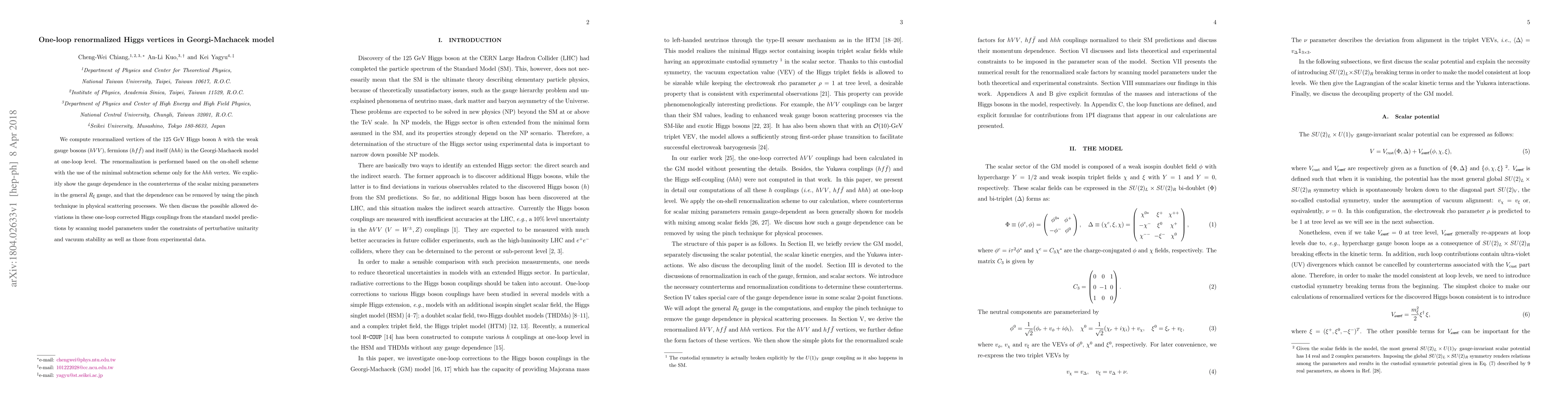 We compute renormalized vertices of the 125 GeV Higgs boson $h$ with the weak gauge bosons ($hVV$), fermions ($hf\bar{f}$) and itself ($hhh$) in the Georgi-Machacek model at one-loop level. The renormalization is performed based on the on-shell scheme with the use of the minimal subtraction scheme only for the $hhh$ vertex. We explicitly show the gauge dependence in the counterterms of the scalar mixing parameters in the general $R_\xi$ gauge, and that the dependence can be removed by using the pinch technique in physical scattering processes. We then discuss the possible allowed deviations in these one-loop corrected Higgs couplings from the standard model predictions by scanning model parameters under the constraints of perturbative unitarity and vacuum stability as well as those from experimental data.