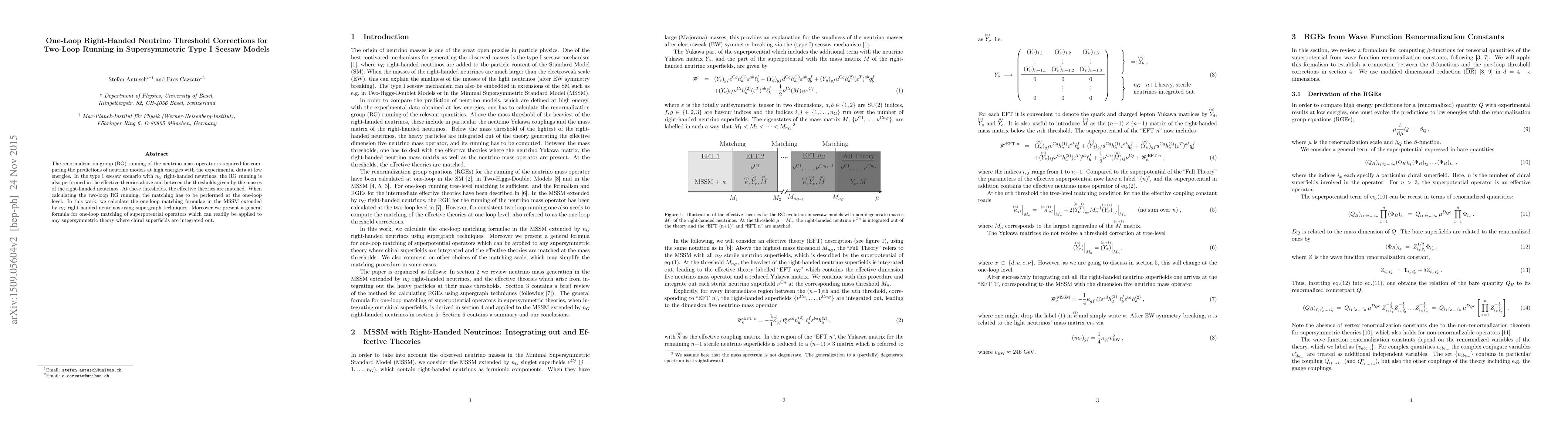 This paper calculates one-loop right-handed neutrino threshold corrections for two-loop running in supersymmetric Type I seesaw models, employing supergraph techniques. It also provides a general formula for one-loop matching of superpotential operators applicable to any supersymmetric theory.