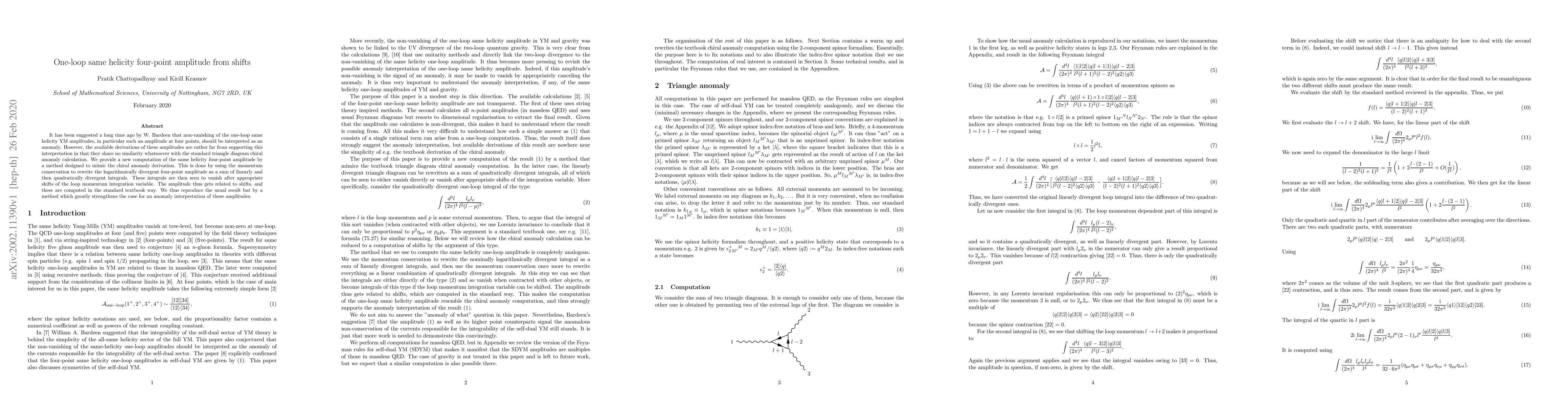 Researchers develop a new method to compute the same helicity four-point amplitude, finding it relates to shifts that vanish after reparameterization, supporting an anomaly interpretation of these amplitudes.