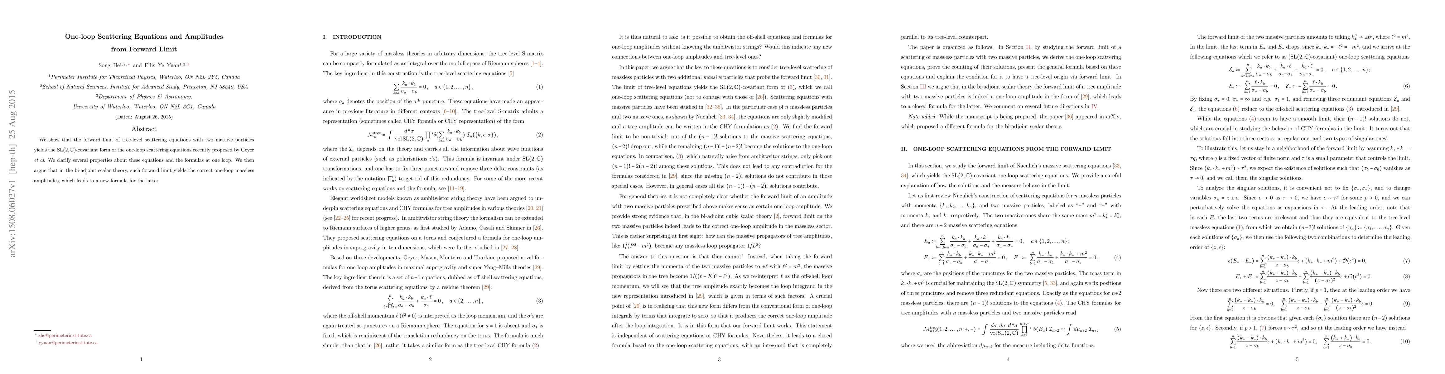 We show that the forward limit of tree-level scattering equations with two massive particles yields the SL(2,C)-covariant form of the one-loop scattering equations recently proposed by Geyer et al. We clarify several properties about these equations and the formulas at one loop. We then argue that in the bi-adjoint scalar theory, such forward limit yields the correct one-loop massless amplitudes, which leads to a new formula for the latter.
