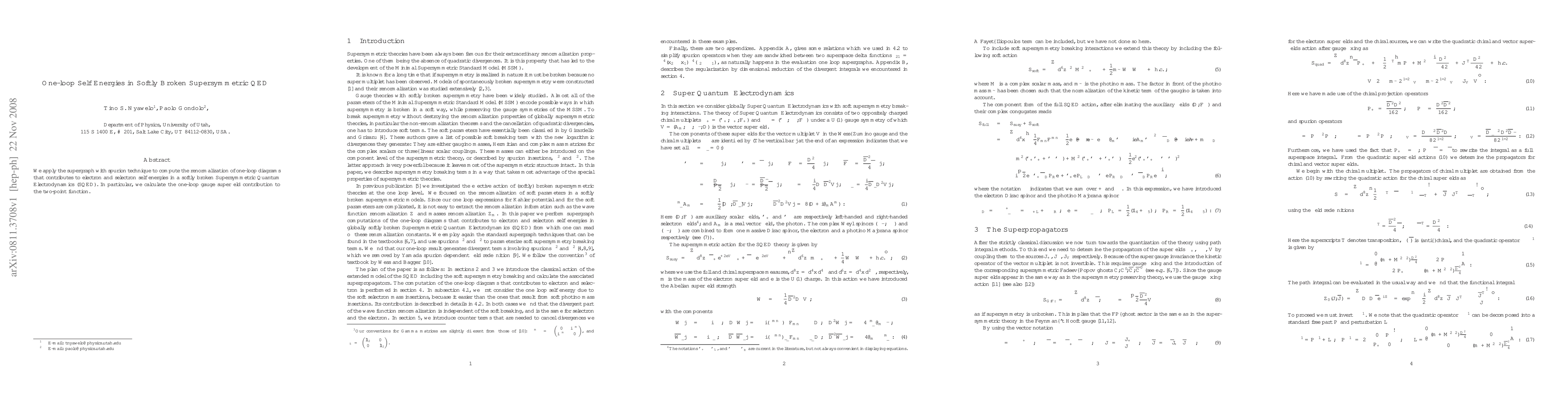 This paper employs the supergraph with spurion technique to calculate one-loop self-energy contributions to electron and selectron in softly broken Supersymmetric Quantum Electrodynamics (SQED), focusing on the gauge superfield contributions to the two-point function. The study aims to understand renormalization effects in this supersymmetric framework.