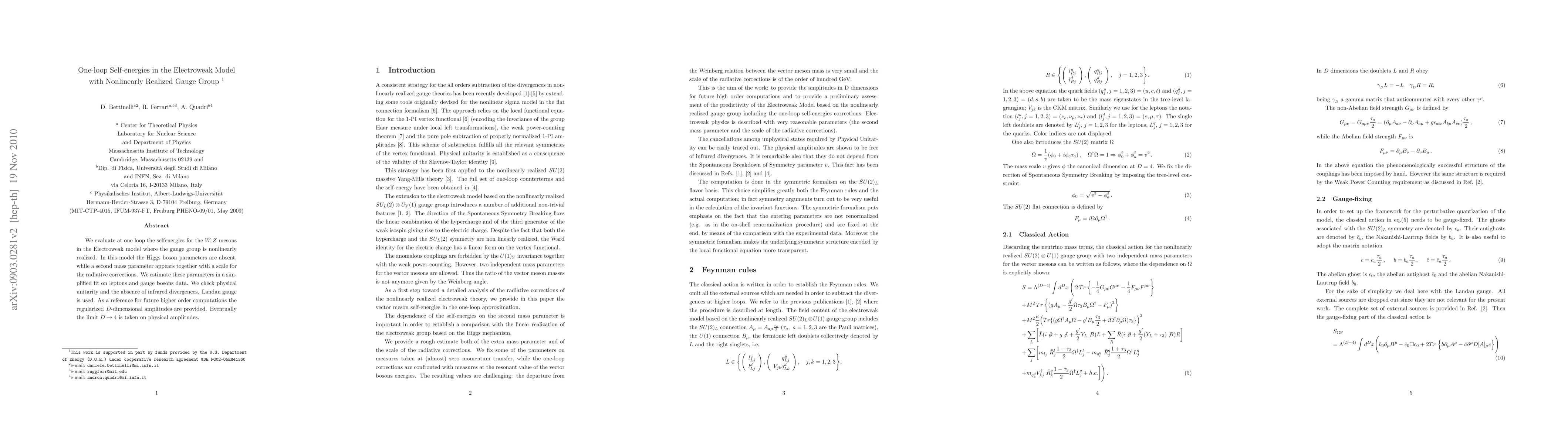 We evaluate at one loop the self-energies in generic D dimensions for the W,Z mesons in the Electroweak model where the gauge group is nonlinearly realized. In this model the Higgs boson parameters are absent, while a second mass parameter appears together with a scale for the radiative corrections. We estimate these parameters in a simplified fit on leptons and gauge bosons data. We check physical unitarity and the absence of infrared divergences. Landau gauge is used.