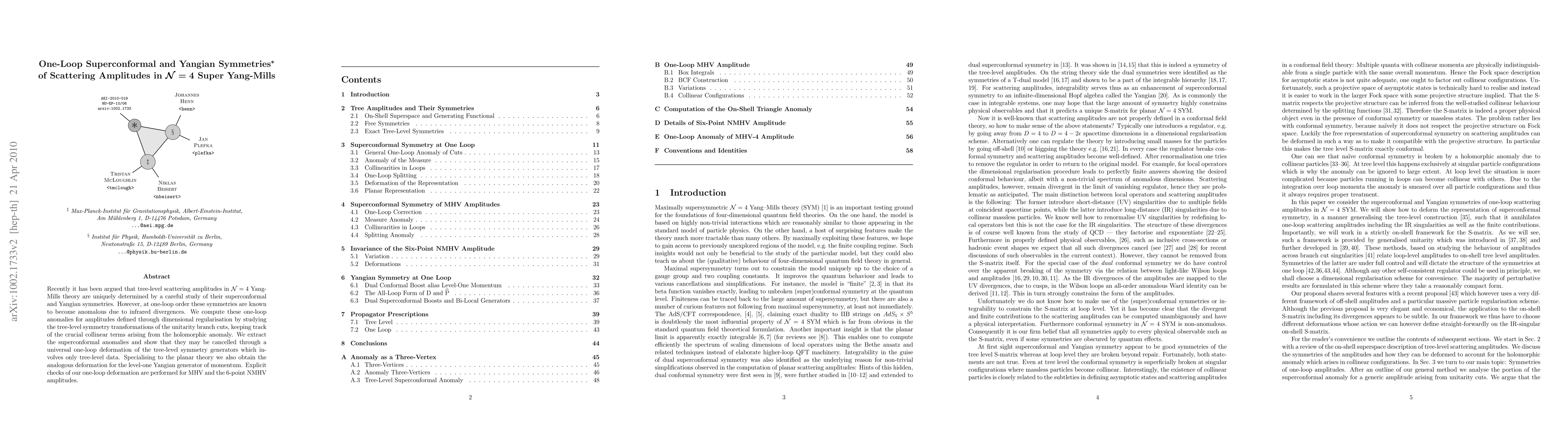 This paper computes one-loop anomalies in N=4 Super Yang-Mills theory, revealing that superconformal symmetries are anomalous due to infrared divergences. It demonstrates that these anomalies can be cancelled via a universal one-loop deformation of the symmetry generators, using only tree-level data, and verifies this for specific MHV and NMHV amplitudes.