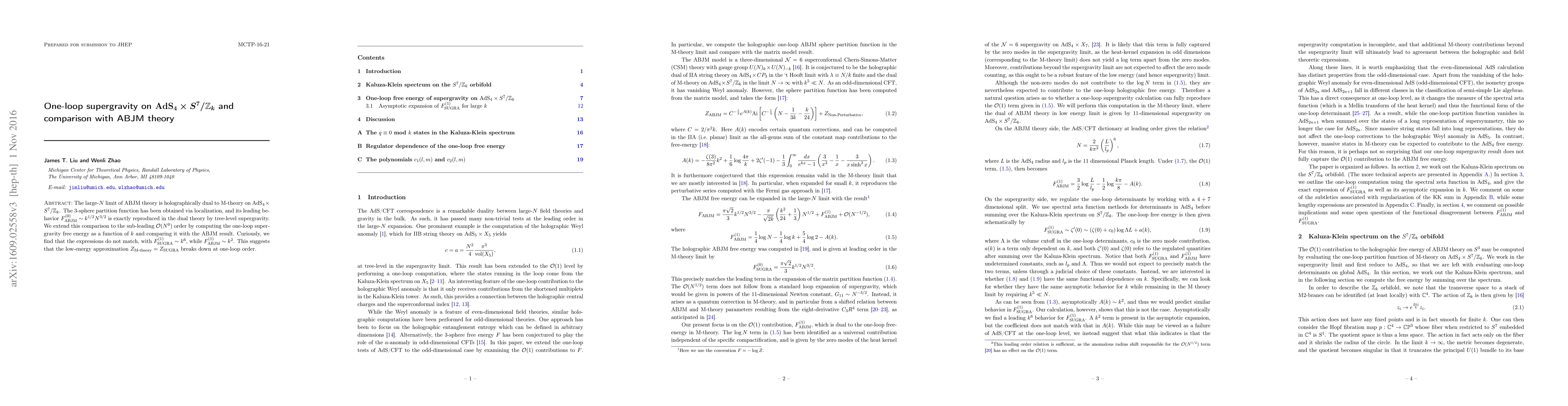 This paper computes the one-loop supergravity free energy in M-theory on $\mathrm{AdS}_4\times S^7/\mathbb{Z}_k$ and finds it does not match the sub-leading $\mathcal O(N^0)$ order term from ABJM theory, suggesting the low-energy equivalence between M-theory and supergravity breaks down at one-loop.