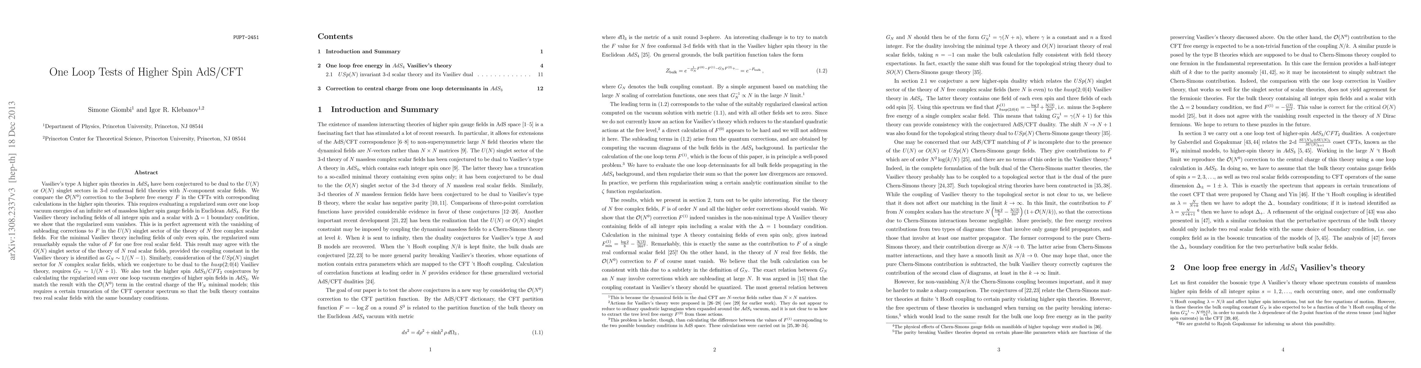 This paper investigates the conjectured duality between higher spin theories in AdS space and conformal field theories (CFTs) by comparing one-loop corrections in both frameworks. It finds that the regularized sum of vacuum energies in higher spin theories matches the free energy and central charge corrections in the corresponding CFTs, supporting the AdS/CFT correspondence for various sectors.
