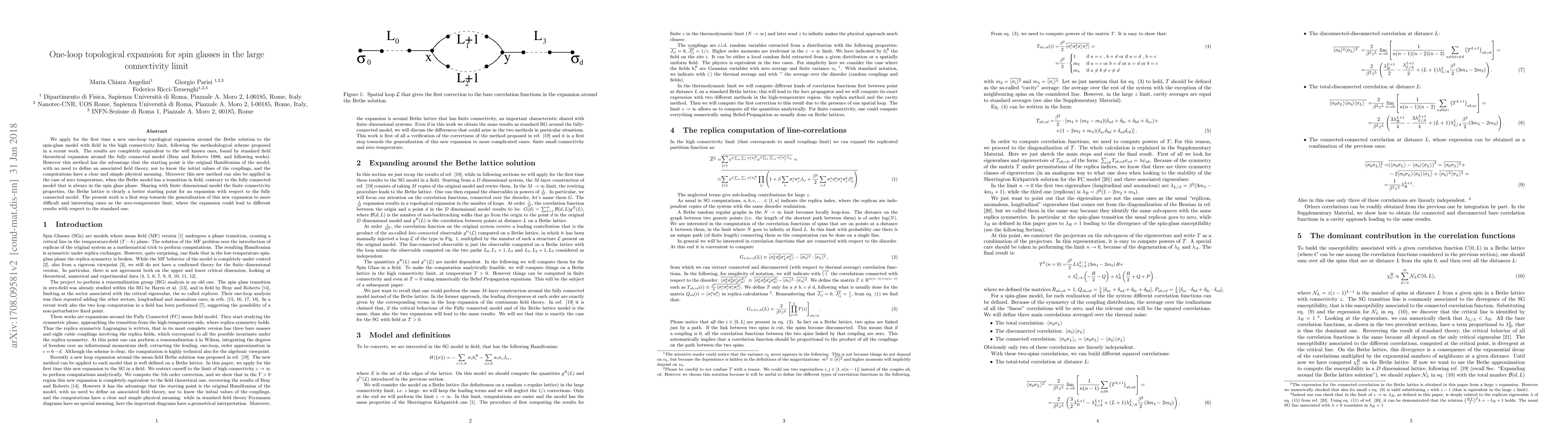 This paper introduces a new one-loop topological expansion method for spin glasses in high connectivity limits, equivalent to traditional field theoretical approaches but starting directly from the original Hamiltonian. This method offers clearer physical interpretations and can be applied at zero temperature, unlike the fully connected model.