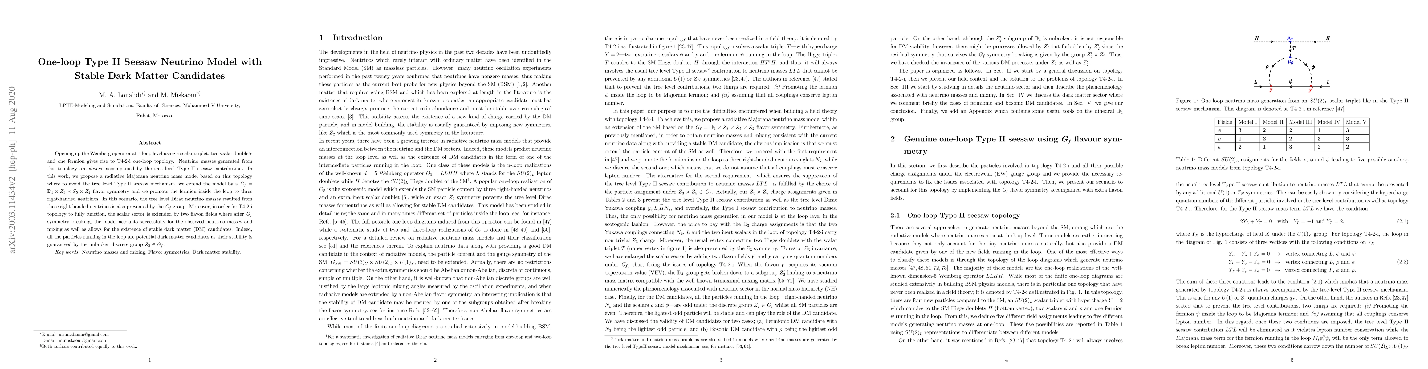This paper proposes a one-loop Type II seesaw model with a stable dark matter candidate, utilizing a scalar triplet, two scalar doublets, and three right-handed neutrinos. The model incorporates a flavor symmetry group to prevent tree-level Type II seesaw and Dirac neutrino masses, and includes flavon fields for successful neutrino mass generation and dark matter stability.