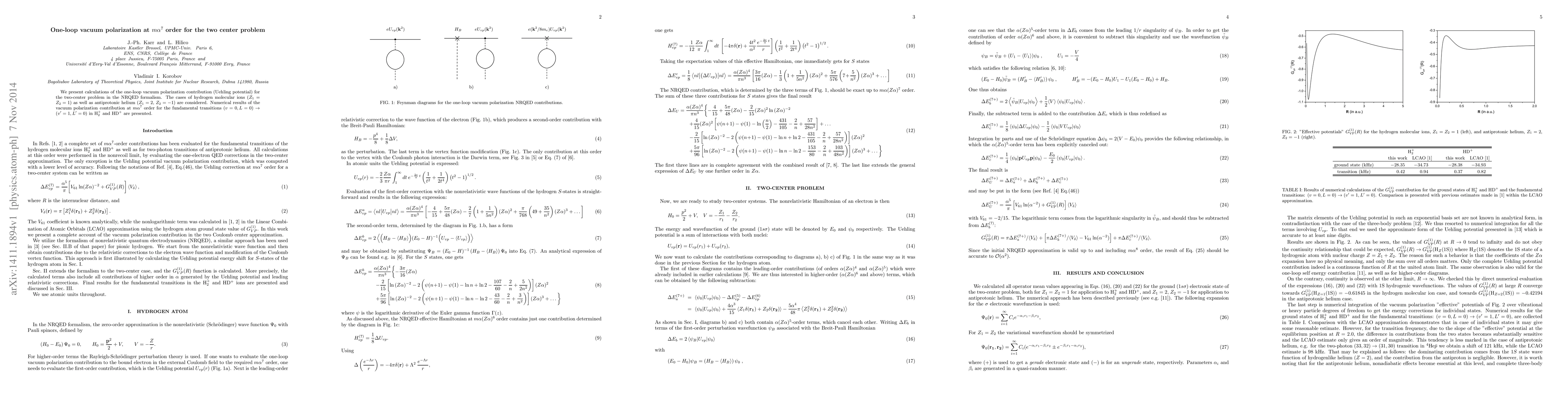 Researchers calculated the one-loop vacuum polarization for two-center problems in atomic physics, including hydrogen molecular ions and antiprotonic helium, with results presented at a specific order of accuracy.