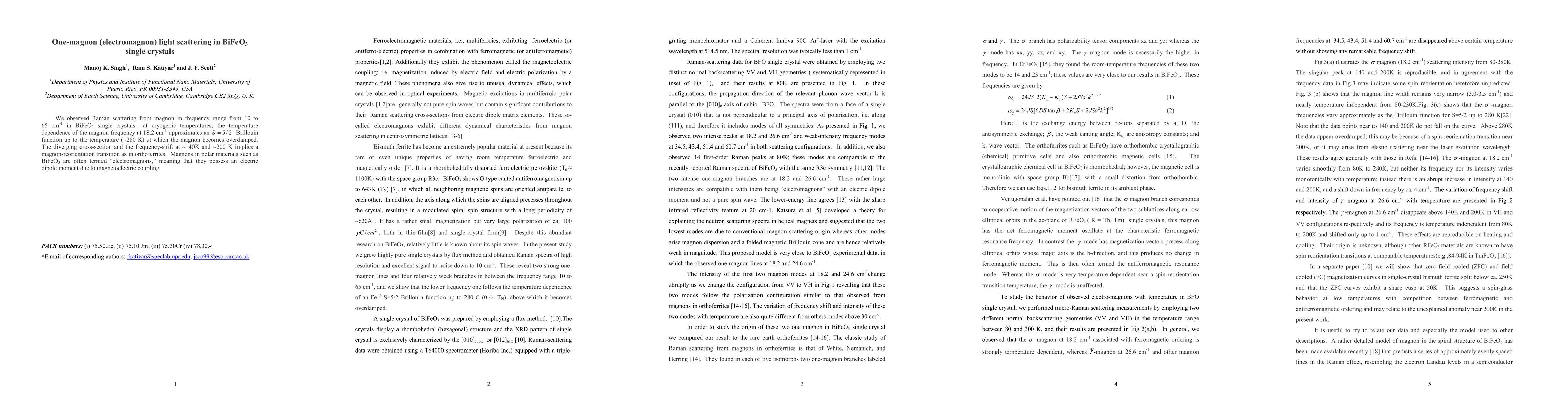 We observed Raman scattering from magnon in frequency range from 10 to 65 cm-1 in BiFeO3 single crystals at cryogenic temperatures; the temperature dependence of the magnon frequency at 18.2 cm-1 approximates an S=5/2 Brillouin function up to the temperature (280 K) at which the magnon becomes overdamped. The diverging cross-section and the frequency-shift at 140K and 200 K implies a magnon-reorientation transition as in orthoferrites. Magnons in polar materials such as BiFeO3 are often termed electromagnons meaning that they possess an electric dipole moment due to magnetoelectric coupling.
