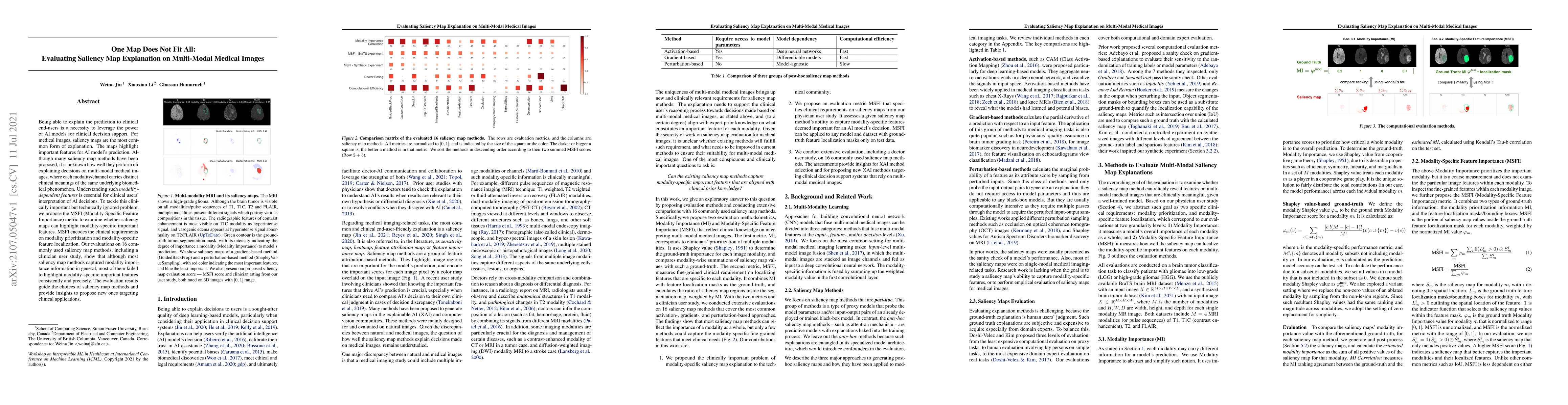 Being able to explain the prediction to clinical end-users is a necessity to leverage the power of AI models for clinical decision support. For medical images, saliency maps are the most common form of explanation. The maps highlight important features for AI model's prediction. Although many saliency map methods have been proposed, it is unknown how well they perform on explaining decisions on multi-modal medical images, where each modality/channel carries distinct clinical meanings of the same underlying biomedical phenomenon. Understanding such modality-dependent features is essential for clinical users' interpretation of AI decisions. To tackle this clinically important but technically ignored problem, we propose the MSFI (Modality-Specific Feature Importance) metric to examine whether saliency maps can highlight modality-specific important features. MSFI encodes the clinical requirements on modality prioritization and modality-specific feature localization. Our evaluations on 16 commonly used saliency map methods, including a clinician user study, show that although most saliency map methods captured modality importance information in general, most of them failed to highlight modality-specific important features consistently and precisely. The evaluation results guide the choices of saliency map methods and provide insights to propose new ones targeting clinical applications.