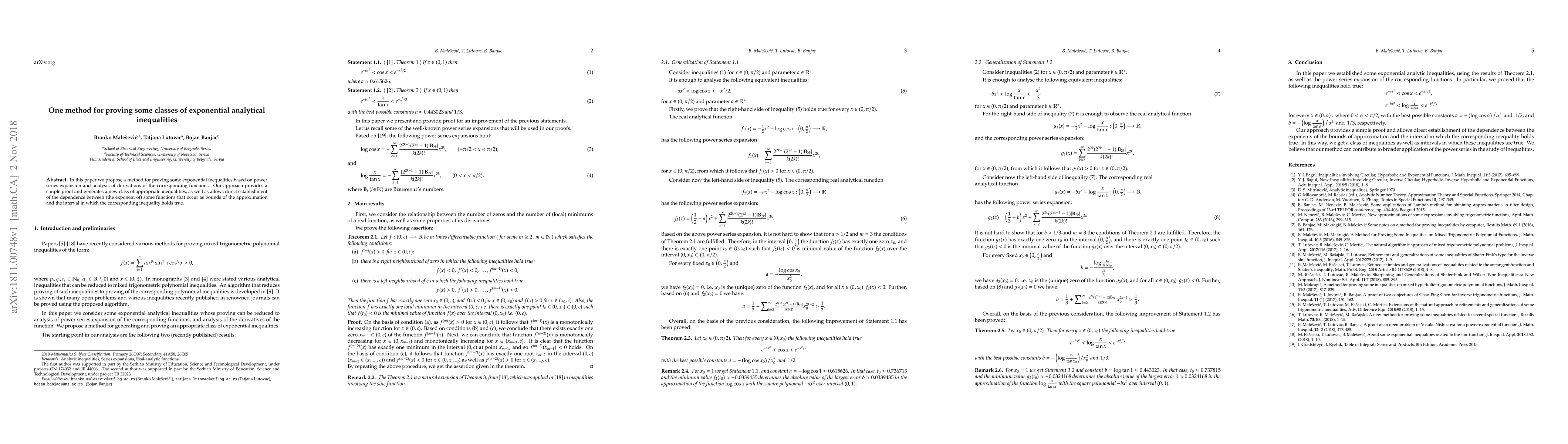 In this paper we propose a method for proving some exponential inequalities based on power series expansion and analysis of derivations of the corresponding functions. Our approach provides a simple proof and generates a new class of appropriate inequalities, as well as allows direct establishment of the dependence between (the exponent of) some functions that occur as bounds of the approximation and the interval in which the corresponding inequality holds true.