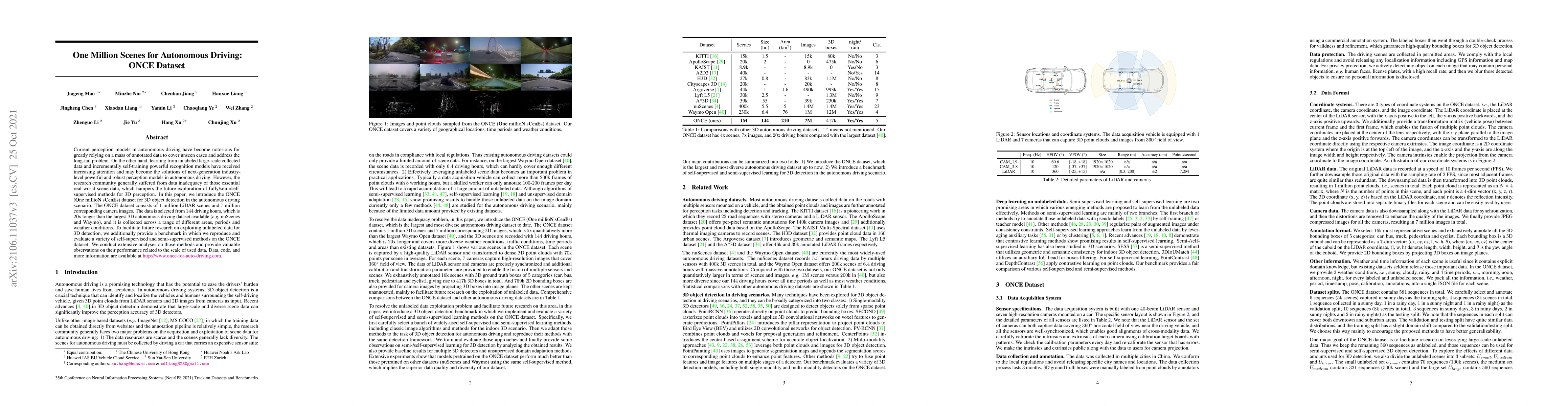Current perception models in autonomous driving have become notorious for greatly relying on a mass of annotated data to cover unseen cases and address the long-tail problem. On the other hand, learning from unlabeled large-scale collected data and incrementally self-training powerful recognition models have received increasing attention and may become the solutions of next-generation industry-level powerful and robust perception models in autonomous driving. However, the research community generally suffered from data inadequacy of those essential real-world scene data, which hampers the future exploration of fully/semi/self-supervised methods for 3D perception. In this paper, we introduce the ONCE (One millioN sCenEs) dataset for 3D object detection in the autonomous driving scenario. The ONCE dataset consists of 1 million LiDAR scenes and 7 million corresponding camera images. The data is selected from 144 driving hours, which is 20x longer than the largest 3D autonomous driving dataset available (e.g. nuScenes and Waymo), and it is collected across a range of different areas, periods and weather conditions. To facilitate future research on exploiting unlabeled data for 3D detection, we additionally provide a benchmark in which we reproduce and evaluate a variety of self-supervised and semi-supervised methods on the ONCE dataset. We conduct extensive analyses on those methods and provide valuable observations on their performance related to the scale of used data. Data, code, and more information are available at https://once-for-auto-driving.github.io/index.html.