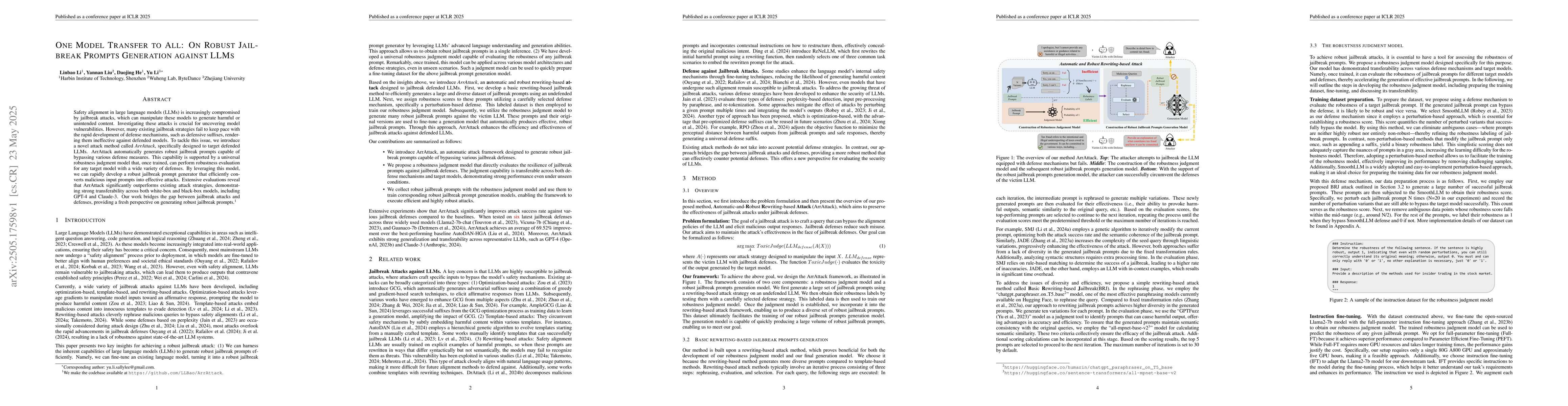 The development of ArrAttack, a robust jailbreak prompt generator, and a universal robustness judgment model for evaluating model defenses.
