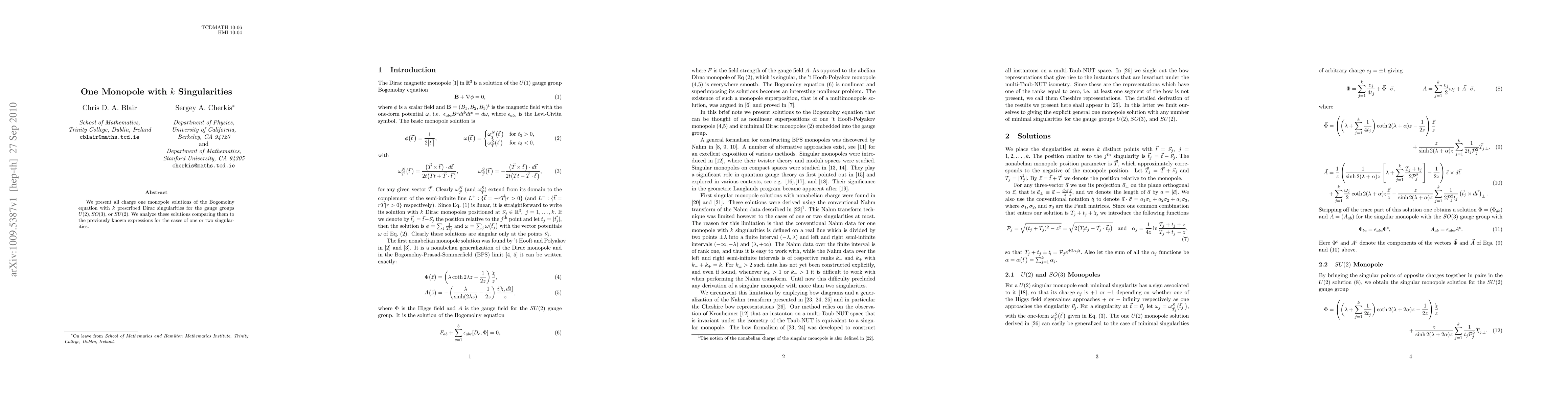 We present all charge one monopole solutions of the Bogomolny equation with k prescribed Dirac singularities for the gauge groups U(2), SO(3), or SU(2). We analyze these solutions comparing them to the previously known expressions for the cases of one or two singularities.