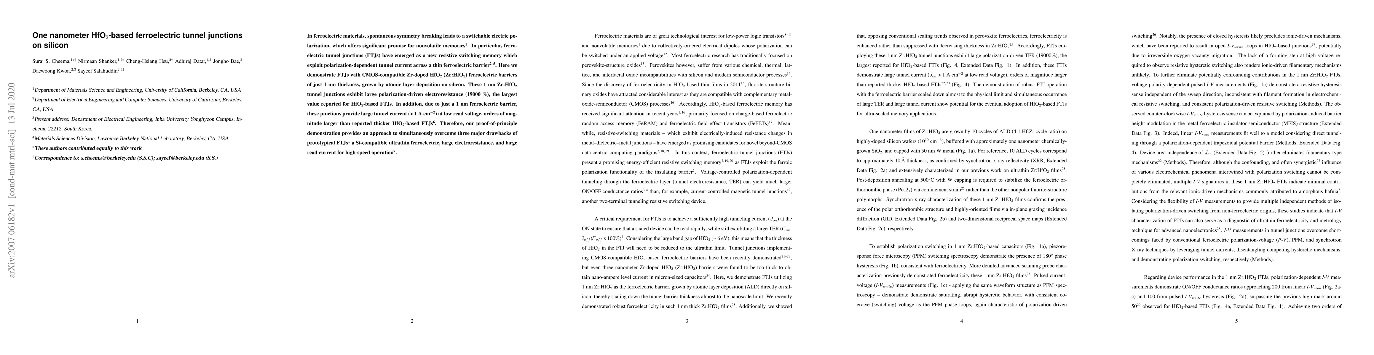 This paper demonstrates 1 nm Zr-doped HfO$_2$ ferroelectric tunnel junctions on silicon, achieving the largest polarization-driven electroresistance reported for HfO$_2$-based FTJs and a large tunnel current at low read voltage, addressing key limitations of traditional FTJs.