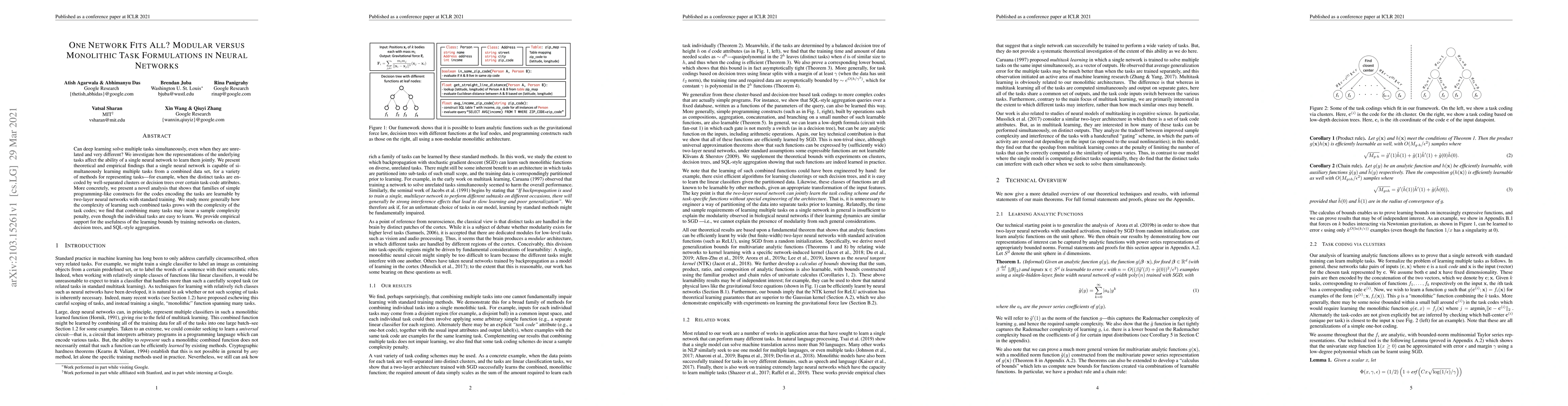 Can deep learning solve multiple tasks simultaneously, even when they are unrelated and very different? We investigate how the representations of the underlying tasks affect the ability of a single neural network to learn them jointly. We present theoretical and empirical findings that a single neural network is capable of simultaneously learning multiple tasks from a combined data set, for a variety of methods for representing tasks -- for example, when the distinct tasks are encoded by well-separated clusters or decision trees over certain task-code attributes. More concretely, we present a novel analysis that shows that families of simple programming-like constructs for the codes encoding the tasks are learnable by two-layer neural networks with standard training. We study more generally how the complexity of learning such combined tasks grows with the complexity of the task codes; we find that combining many tasks may incur a sample complexity penalty, even though the individual tasks are easy to learn. We provide empirical support for the usefulness of the learning bounds by training networks on clusters, decision trees, and SQL-style aggregation.