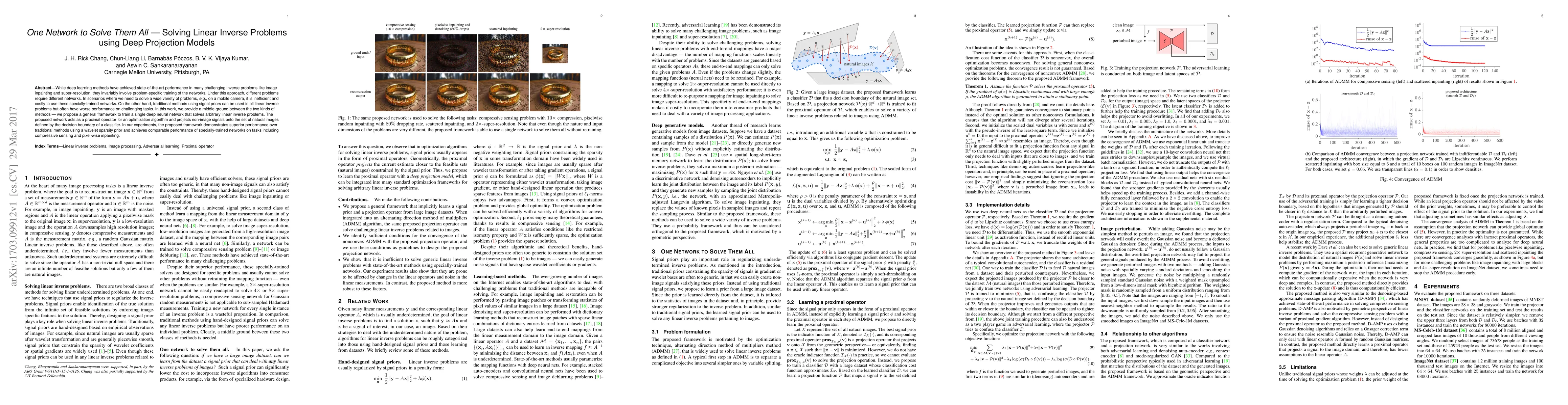 This paper proposes a single deep neural network to solve various linear inverse problems, bridging the gap between specialized deep learning methods and traditional signal prior approaches. The network acts as a proximal operator, achieving superior performance over traditional methods and comparable results to specially-trained networks for tasks like compressive sensing and inpainting.