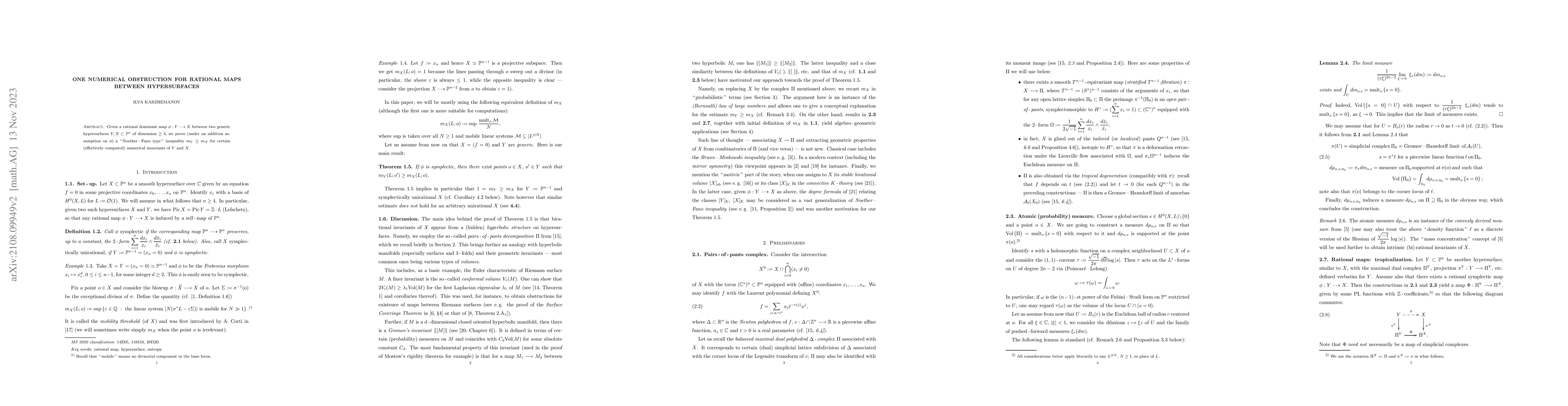 Given a rational dominant map $\phi: Y \dashrightarrow X$ between two generic hypersurfaces $Y,X \subset \mathbb{P}^n$ of dimension $\ge 3$, we prove (under an addition assumption on $\phi$) a "Noether-Fano type" inequality $m_Y \ge m_X$ for certain (effectively computed) numerical invariants of $Y$ and $X$.