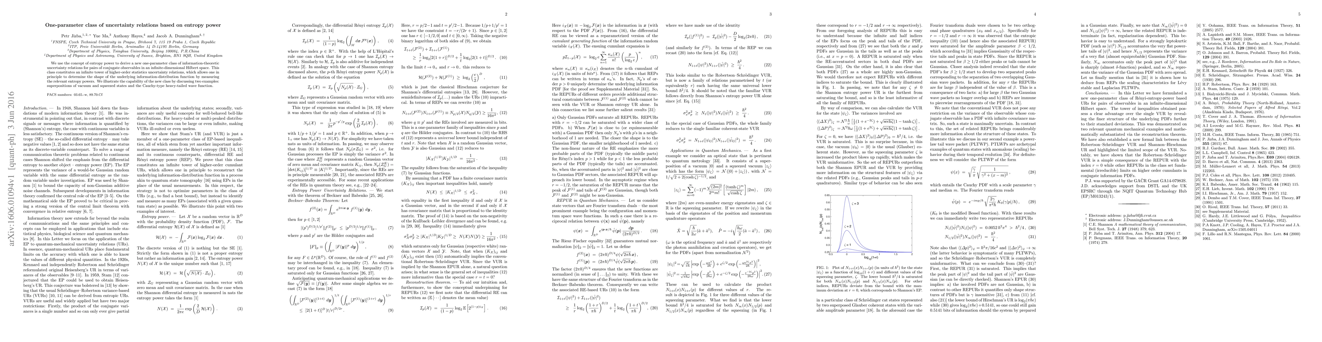 We use the concept of entropy power to derive a new one-parameter class of information-theoretic uncertainty relations for pairs of conjugate observables in an infinite-dimensional Hilbert space. This class constitutes an infinite tower of higher-order statistics uncertainty relations, which allows one in principle to determine the shape of the underlying information-distribution function by measuring the relevant entropy powers. We illustrate the capability of the new class by discussing two examples: superpositions of vacuum and squeezed states and the Cauchy-type heavy-tailed wave function.