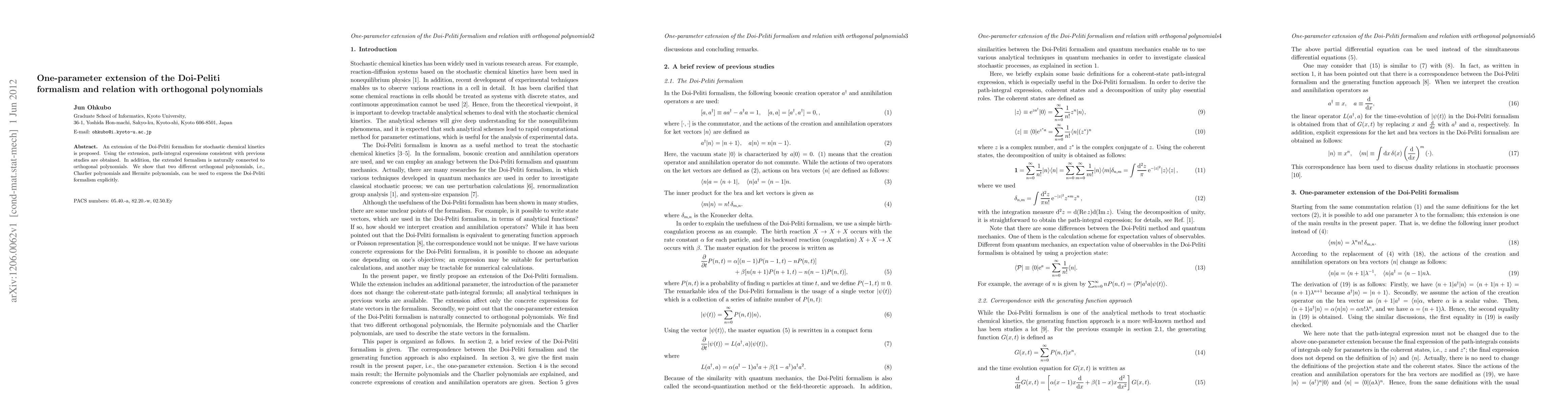 This paper proposes a one-parameter extension of the Doi-Peliti formalism for stochastic chemical kinetics, deriving path-integral expressions consistent with prior studies. It also establishes a natural link between the extended formalism and orthogonal polynomials, specifically using Charlier and Hermite polynomials for explicit expression.
