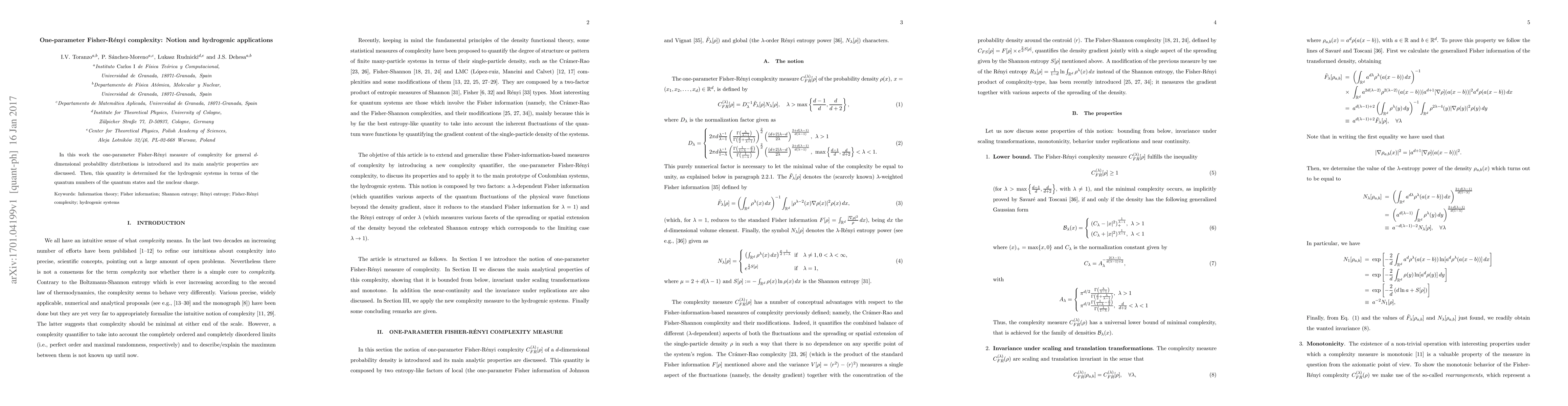 This paper introduces the one-parameter Fisher-Rényi measure of complexity for $d$-dimensional probability distributions and explores its analytic properties. It then applies this complexity measure to hydrogenic systems, linking it to quantum numbers and nuclear charge.