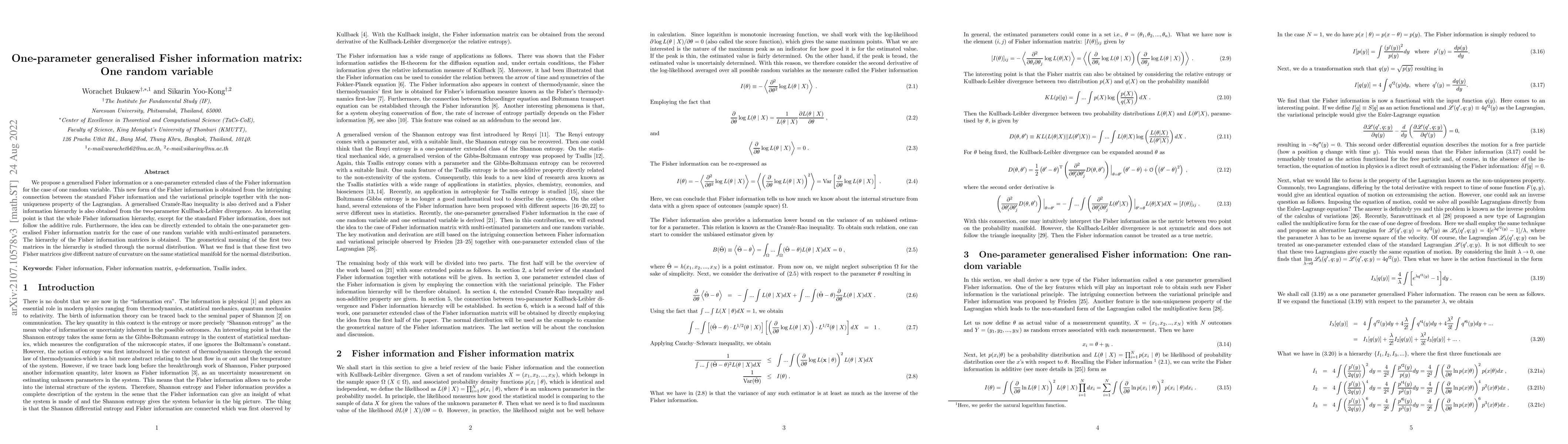 The research introduces a one-parameter generalised Fisher information for one random variable, derived using the variational principle and the non-uniqueness property of the Lagrangian. The generalised Cramér-Rao inequality is also derived.