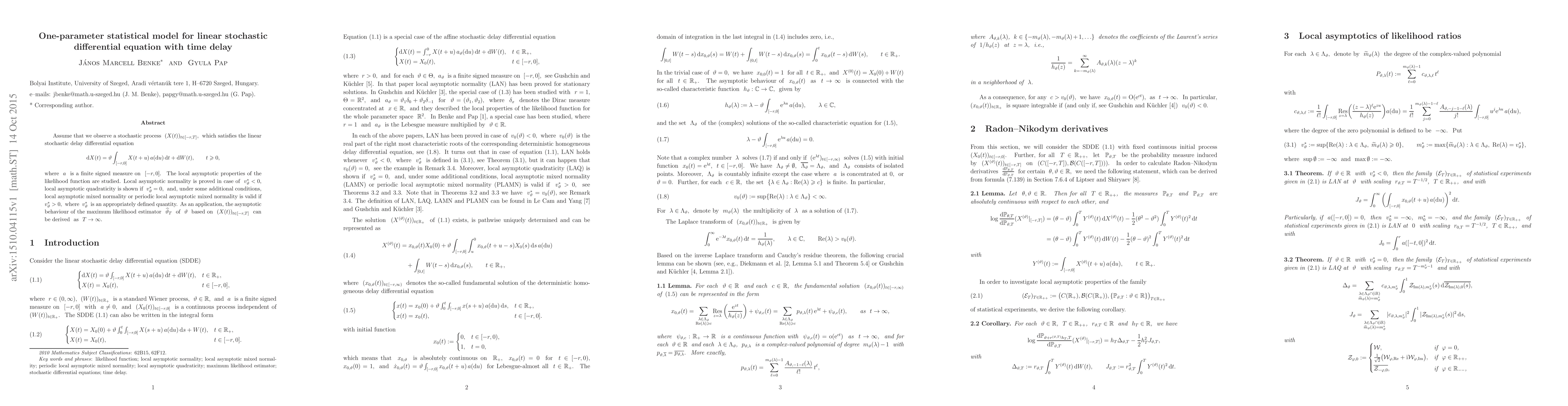Assume that we observe a stochastic process $(X(t))_{t\in[-r,T]}$, which satisfies the linear stochastic delay differential equation \[ \mathrm{d} X(t) = \vartheta \int_{[-r,0]} X(t + u) \, a(\mathrm{d} u) \, \mathrm{d} t + \mathrm{d} W(t) , \qquad t \geq 0 , \] where $a$ is a finite signed measure on $[-r, 0]$. The local asymptotic properties of the likelihood function are studied. Local asymptotic normality is proved in case of $v_\vartheta^* < 0$, local asymptotic quadraticity is shown if $v_\vartheta^* = 0$, and, under some additional conditions, local asymptotic mixed normality or periodic local asymptotic mixed normality is valid if $v_\vartheta^* > 0$, where $v_\vartheta^*$ is an appropriately defined quantity. As an application, the asymptotic behaviour of the maximum likelihood estimator $\widehat{\vartheta}_T$ of $\vartheta$ based on $(X(t))_{t\in[-r,T]}$ can be derived as $T \to \infty$.