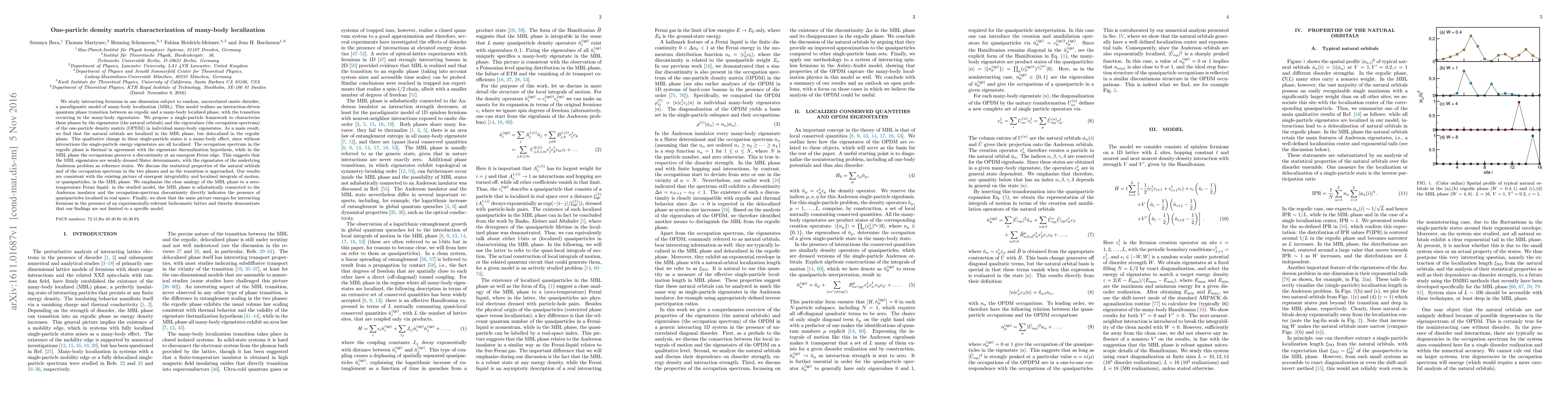 This paper investigates a one-dimensional model of interacting fermions under random disorder, revealing an interaction-driven quantum phase transition between ergodic and many-body localized phases. It proposes a single-particle framework based on the one-particle density matrix to characterize these phases, finding that natural orbitals are localized in the MBL phase and delocalized in the ergodic phase, supporting the picture of emergent quasiparticles in the MBL phase akin to a zero-temperature Fermi liquid.