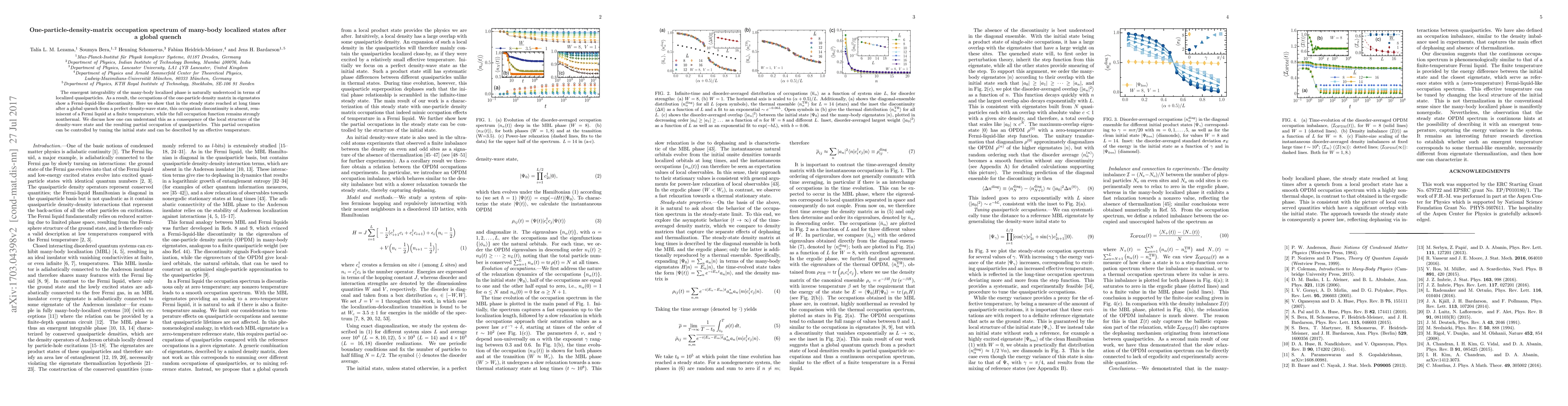 This paper investigates the one-particle-density-matrix occupation spectrum in many-body localized states following a global quench, revealing that the usual Fermi-liquid-like discontinuity in occupations disappears in the long-term steady state, indicating a nonthermal yet partially occupied quasiparticle structure akin to a finite-temperature Fermi liquid. The partial occupation can be manipulated by adjusting the initial state, suggesting an effective temperature-like control.