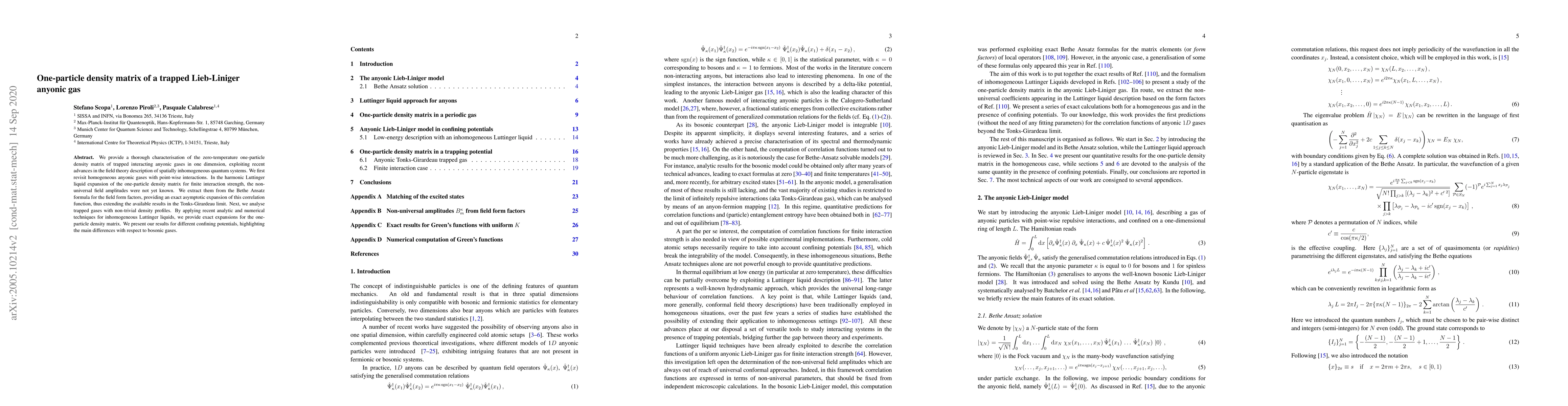 We provide a thorough characterisation of the zero-temperature one-particle density matrix of trapped interacting anyonic gases in one dimension, exploiting recent advances in the field theory description of spatially inhomogeneous quantum systems. We first revisit homogeneous anyonic gases with point-wise interactions. In the harmonic Luttinger liquid expansion of the one-particle density matrix for finite interaction strength, the non-universal field amplitudes were not yet known. We extract them from the Bethe Ansatz formula for the field form factors, providing an exact asymptotic expansion of this correlation function, thus extending the available results in the Tonks-Girardeau limit. Next, we analyse trapped gases with non-trivial density profiles. By applying recent analytic and numerical techniques for inhomogeneous Luttinger liquids,we provide exact expansions for the one-particle density matrix. We present our results for different confining potentials, highlighting the main differences with respect to bosonic gases.