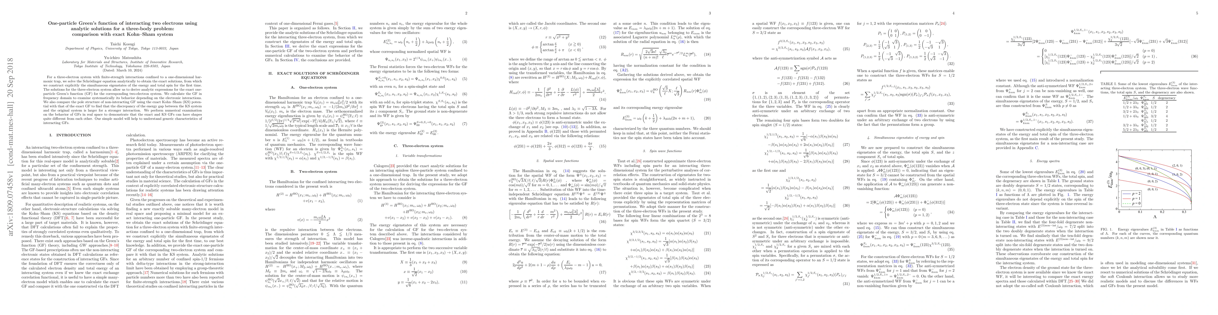 For a three-electron system with finite-strength interactions confined to a one-dimensional harmonic trap, we solve the Schroedinger equation analytically to obtain the exact solutions, from which we construct explicitly the simultaneous eigenstates of the energy and total spin for the first time. The solutions for the three-electron system allow us to derive analytic expressions for the exact one-particle Green's function (GF) for the corresponding two-electron system. We calculate the GF in frequency domain to examine systematically its behavior depending on the electronic interactions. We also compare the pole structure of non-interacting GF using the exact Kohn--Sham (KS) potential with that of the exact GF to find that the discrepancy of the energy gap between the KS system and the original system is larger for a stronger interaction. We perform numerical examination on the behavior of GFs in real space to demonstrate that the exact and KS GFs can have shapes quite different from each other. Our simple model will help to understand generic characteristics of interacting GFs.