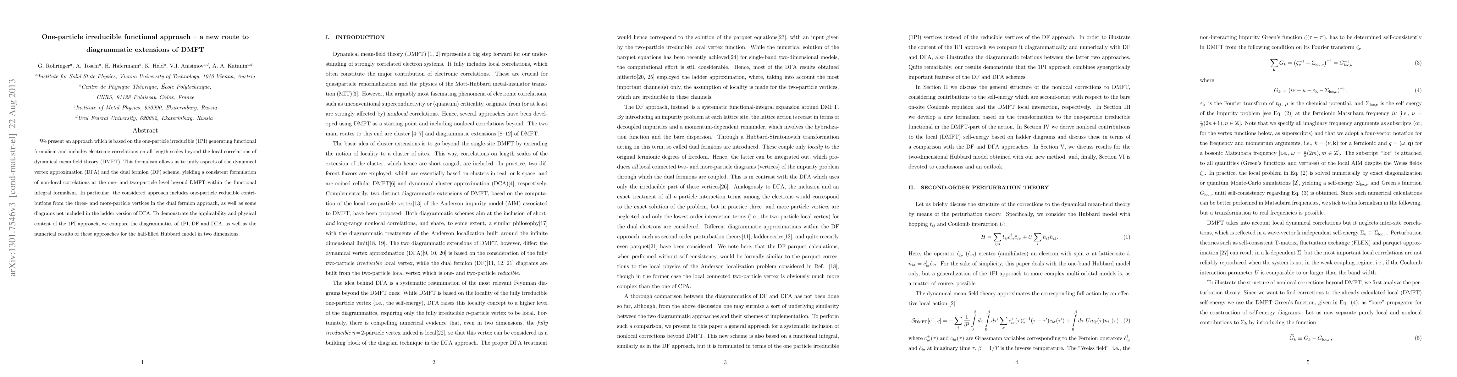 We present an approach which is based on the one-particle irreducible (1PI) generating functional formalism and includes electronic correlations on all length-scales beyond the local correlations of dynamical mean field theory (DMFT). This formalism allows us to unify aspects of the dynamical vertex approximation (D\GammaA) and the dual fermion (DF) scheme, yielding a consistent formulation of non-local correlations at the one- and two-particle level beyond DMFT within the functional integral formalism. In particular, the considered approach includes one-particle reducible contributions from the three- and more-particle vertices in the dual fermion approach, as well as some diagrams not included in the ladder version of D\GammaA. To demonstrate the applicability and physical content of the 1PI approach, we compare the diagrammatics of 1PI, DF and D\GammaA, as well as the numerical results of these approaches for the half-filled Hubbard model in two dimensions.