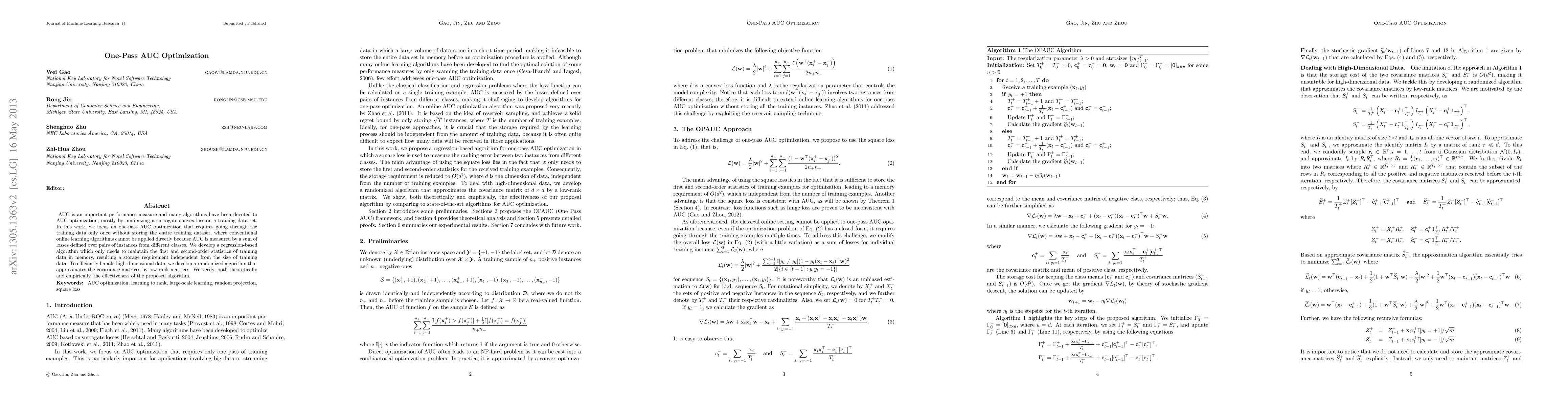 This paper proposes a one-pass AUC optimization algorithm that requires only a single pass through training data without storing the entire dataset, using a regression-based approach that maintains first and second-order statistics. To handle high-dimensional data efficiently, a randomized algorithm approximates covariance matrices with low-rank matrices, and its effectiveness is validated both theoretically and empirically.