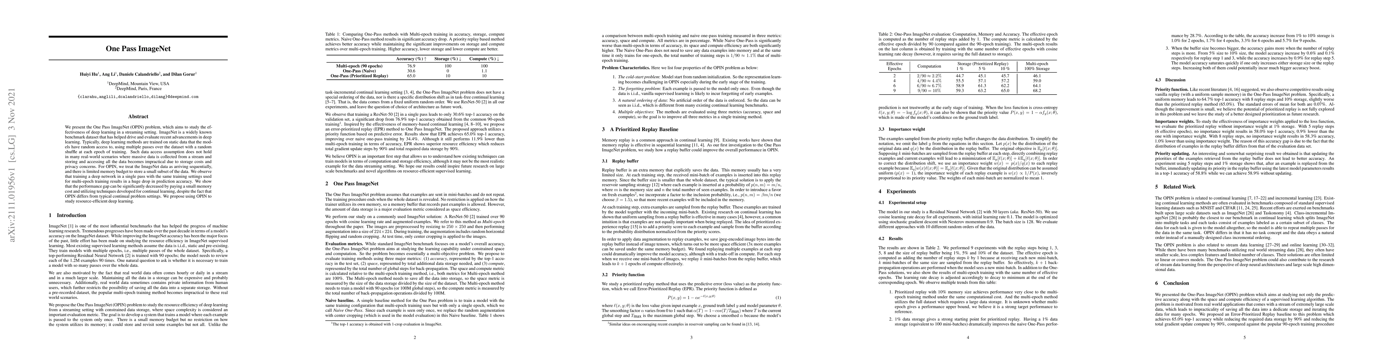 We present the One Pass ImageNet (OPIN) problem, which aims to study the effectiveness of deep learning in a streaming setting. ImageNet is a widely known benchmark dataset that has helped drive and evaluate recent advancements in deep learning. Typically, deep learning methods are trained on static data that the models have random access to, using multiple passes over the dataset with a random shuffle at each epoch of training. Such data access assumption does not hold in many real-world scenarios where massive data is collected from a stream and storing and accessing all the data becomes impractical due to storage costs and privacy concerns. For OPIN, we treat the ImageNet data as arriving sequentially, and there is limited memory budget to store a small subset of the data. We observe that training a deep network in a single pass with the same training settings used for multi-epoch training results in a huge drop in prediction accuracy. We show that the performance gap can be significantly decreased by paying a small memory cost and utilizing techniques developed for continual learning, despite the fact that OPIN differs from typical continual problem settings. We propose using OPIN to study resource-efficient deep learning.
