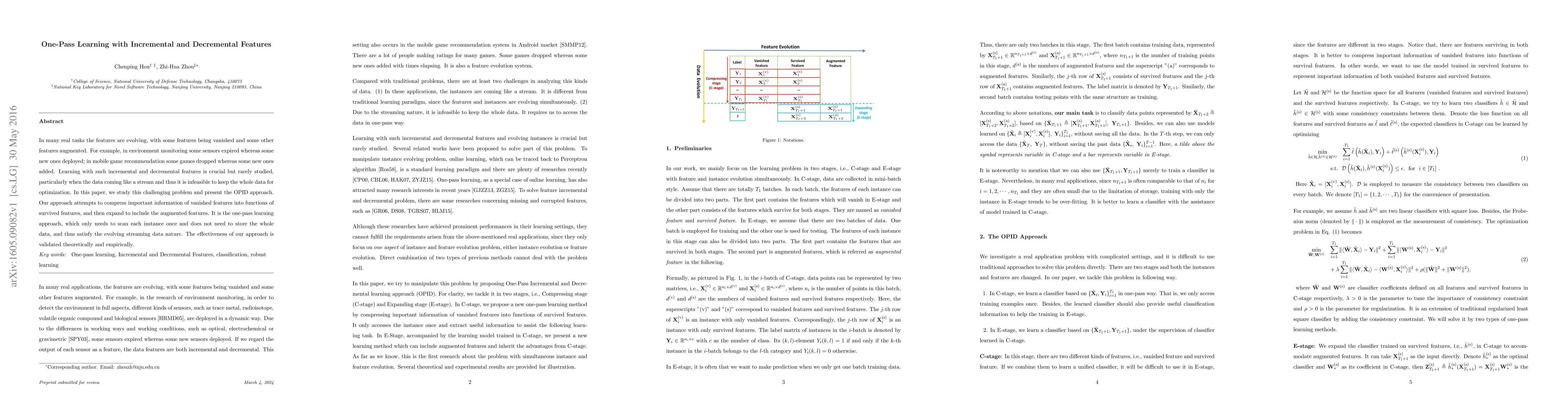 In many real tasks the features are evolving, with some features being vanished and some other features augmented. For example, in environment monitoring some sensors expired whereas some new ones deployed; in mobile game recommendation some games dropped whereas some new ones added. Learning with such incremental and decremental features is crucial but rarely studied, particularly when the data coming like a stream and thus it is infeasible to keep the whole data for optimization. In this paper, we study this challenging problem and present the OPID approach. Our approach attempts to compress important information of vanished features into functions of survived features, and then expand to include the augmented features. It is the one-pass learning approach, which only needs to scan each instance once and does not need to store the whole data, and thus satisfy the evolving streaming data nature. The effectiveness of our approach is validated theoretically and empirically.