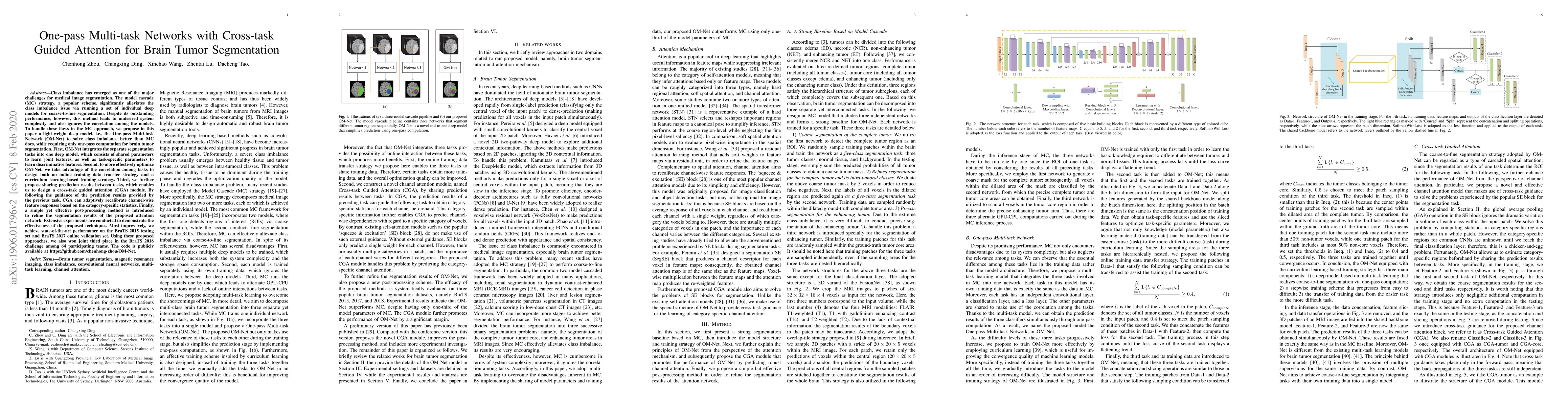 A new deep learning model called One-pass Multi-task Network (OM-Net) achieves state-of-the-art performance in brain tumor segmentation while reducing complexity and improving results through cross-task guided attention.